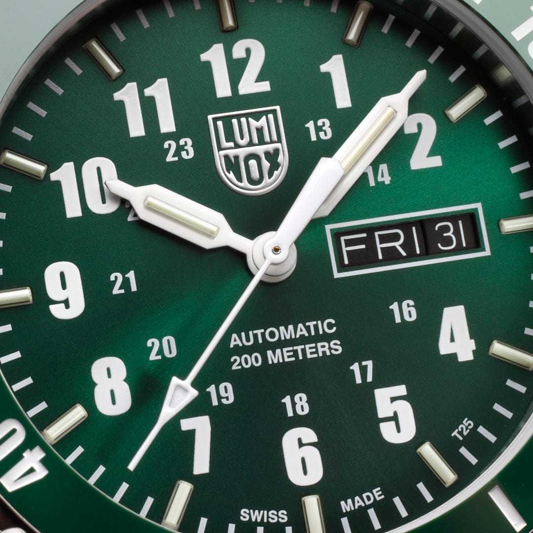 Часы Luminox XS.0937 — истинное воплощение швейцарского качества и современного стиля. Эти мужские часы, оснащённые механизмом с автоподзаводом, предлагают безупречную точность и надёжность, благодаря использованию калибра Sellita SW 220-1 с 26 камнями. Корпус выполнен из высококачественной стали 316L, что придаёт дополнительную прочность и устойчивость к износу. Зеленый циферблат защищён сапфировым стекломСапфировое стеклоПрочный и надёжный материал из кристалла сапфира синтетического происхождения, характеризующийся особой твёрдостью и устойчивостью к царапинам и повреждениям. с антибликовым покрытиемАнтибликовое покрытиеСлой оксида металла в 0,13-0,3 микрон, благодаря которому стекло часов не бликует и не отражает свет. Антибликовое покрытие уменьшает отражение света в 10 раз, обеспечивая отличную читаемость показателей циферблата., что позволяет с лёгкостью считывать показания даже при ярком освещении. Часы обладают функцией отображения даты и дня недели, расположенной в удобном окошке в позиции 3 часа. Вращающийся в одном направлении керамический безельБезельВнешний ободок, закрепляющий стекло. В спортивных часах так называется поворотное кольцо с делениями на циферблате, выполняет роль таймера – замеряет отрезки времени на шкале. Неподвижный безель – элемент декора. Однонаправленно вращающийся безель на дайверских часах позволяет фиксировать моменты погружения и выныривания на поверхность. обеспечивает дополнительную функциональность и стильный вид. Благодаря технологии LLTLLTLLT — это автономный механизм подсветки, основанный на использовании микроскопических газонаполненных элементов. Специальные герметичные капсулы из боросиликатного стекла, интегрированные в циферблат, генерируют свечение без необходимости подключения к внешним источникам энергии. Для их работы не требуется ни дополнительный свет, ни механическое воздействие (например, нажатие кнопки). Свечение возникает благодаря химическому процессу: реакция между тритием, заключенным в капсулах, и люминофорным покрытием создает стабильное автономное освещение. Технология обеспечивает энергетическую независимость и долговечность подсветки.-подсветки, эти часы гарантируют превосходную видимость в темноте на протяжении 25 лет. Завинчивающаяся заводная головка с защитой и прозрачная задняя крышка подчёркивают внимание к деталям и практичность дизайна. Стальной браслет, изготовленный из того же материала, что и корпус, оснащён раскладной застёжкойРаскладная застёжкаТакой тип застёжки используется только на браслетах из металла. Она никогда не раскрывается полностью, происходит разделение на 2 и более частей. Раскладывающая застёжка снизит вероятность потери часов к минимуму. с системой блокировки, обеспечивая надёжную фиксацию на запястье. Водозащита уровня 200WR позволяет использовать часы даже в условиях повышенной влажности. Габаритные размеры составляют 42 мм в диаметре, 13 мм в толщину, с шириной браслета 24 мм и весом 185 г, что делает их идеальным выбором для тех, кто ценит стиль и функциональность в одном аксессуаре.