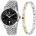 Мужские часы Maserati Epoca R8853118029 — это стильное сочетание элегантности и современного дизайна. Корпус из нержавеющей стали с диаметром 42 мм идеально сбалансирован и элегантен. Минеральное стеклоМинеральное стеклоМинеральное стекло представляет собой искусственно выращенный минерал кварца. Такое стекло отличается особой устойчивостью к повреждениям и царапинам. Уступает по некоторым качествам сапфировому стеклу. защищает циферблат от царапин. Стальной браслет на застёжке-бабочке с кнопкамиЗастёжка "бабочка"Такой вид застёжки дополняется предохранителями, помогающими избежать случайного раскрытия браслета. Обладают изящным исполнением. идеально дополняют дизайн часов, обеспечивая комфортное ношение. Стрелки и метки с люминесцентным покрытиемЛюминесцентное покрытиеПозволяет считывать показания времени в темноте. Производители наносят на стрелки, часовые индексы, безель или поверхность циферблата светонакопительный состав, дающий холодное свечение.. Часы обладают впечатляющей водонепроницаемостью до 10 бар (100 метров), что делает их идеальными для повседневной носки. Метки в виде штрихов. Модель идёт в комплекте с мужским браслетом из гипоаллергенной нержавеющей стали с частичным гальваническим покрытием золотом.