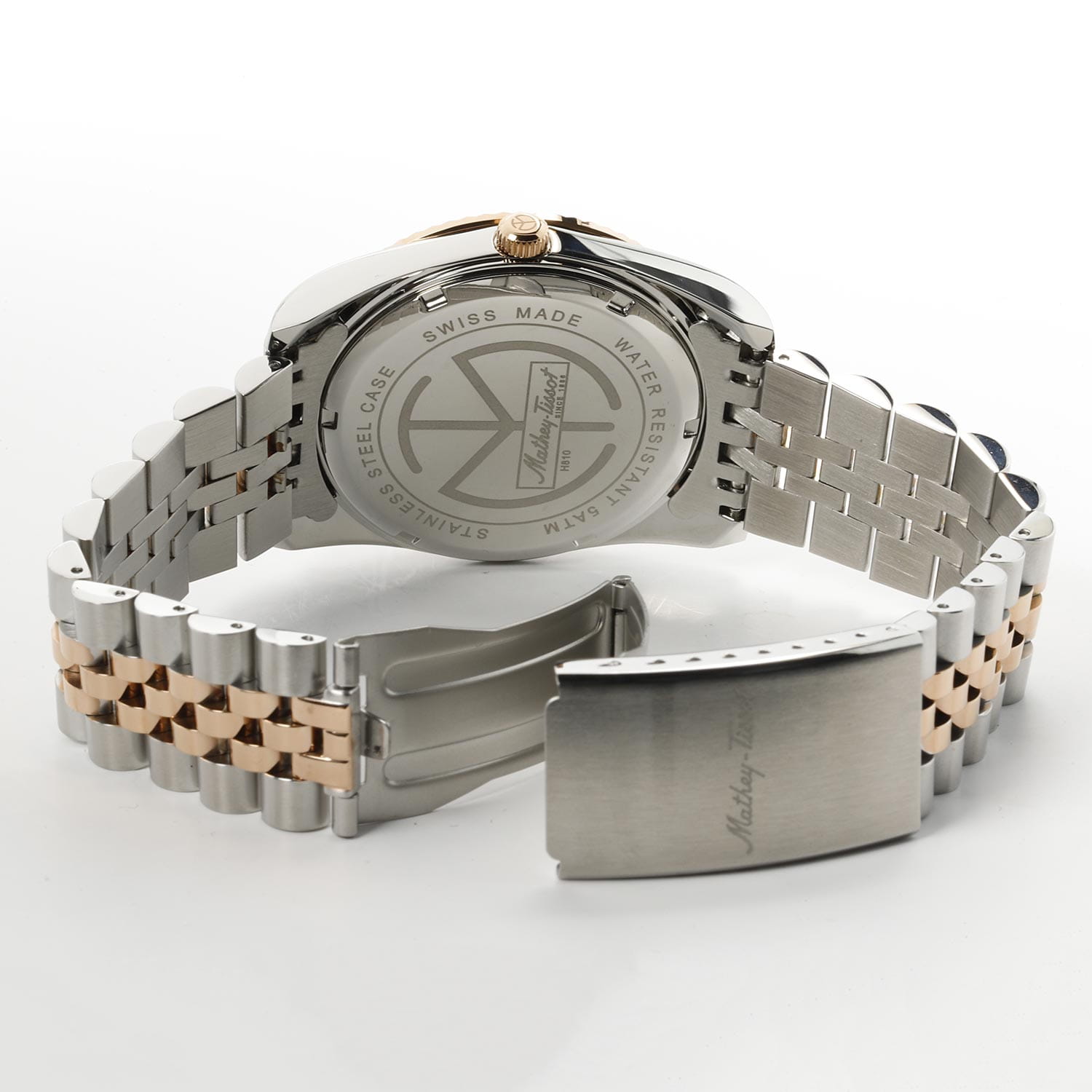 Мужские кварцевые часы Mathey-Tissot Mathy H810RN — это стильное сочетание элегантности и современного дизайна. Изящный корпус выполнен из нержавеющей стали, диаметром 40 мм, что придаст образу элегантности и надежности. Изысканный циферблат с метками в виде штрихов придает модели особый блеск. Циферблат защищен минеральным стекломМинеральное стеклоМинеральное стекло представляет собой искусственно выращенный минерал кварца. Такое стекло отличается особой устойчивостью к повреждениям и царапинам. Уступает по некоторым качествам сапфировому стеклу., обеспечивает устойчивость к царапинам. Стрелки с люминесцентным покрытиемЛюминесцентное покрытиеПозволяет считывать показания времени в темноте. Производители наносят на стрелки, часовые индексы, безель или поверхность циферблата светонакопительный состав, дающий холодное свечение., которое светится в темноте после непродолжительной зарядки на свету. БезельБезельВнешний ободок, закрепляющий стекло. В спортивных часах так называется поворотное кольцо с делениями на циферблате, выполняет роль таймера – замеряет отрезки времени на шкале. Неподвижный безель – элемент декора. Однонаправленно вращающийся безель на дайверских часах позволяет фиксировать моменты погружения и выныривания на поверхность. с PVD-покрытиемPVDУльтратонкое покрытие наносится в технике вакуумного напыления, сочетает в себе нитрид титана особой прочности со слоем золота или оксида хрома. Несёт в себе декоративную или защитную функцию. цвета розового золота. Окошко даты находится в положении 3 часа. Часы оснащены надежным кварцевым механизмом. Стальной браслет с частичным PVD-покрытиемPVDУльтратонкое покрытие наносится в технике вакуумного напыления, сочетает в себе нитрид титана особой прочности со слоем золота или оксида хрома. Несёт в себе декоративную или защитную функцию. на раскладной застёжке с фиксаторомРаскладная застёжкаТакой тип застёжки используется только на браслетах из металла. Она никогда не раскрывается полностью, происходит разделение на 2 и более частей. Раскладывающая застёжка снизит вероятность потери часов к минимуму., гарантирует комфортное и безопасное ношение. Рифленая заводная головка. Класс водозащиты: 50 метров позволит защитить корпус от случайных брызг или капель дождя. Mathey-Tissot  — отличный выбор для тех, кто ценит утонченность и качество.