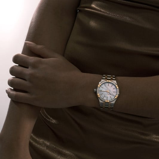 Женские швейцарские кварцевые часы Maurice Lacroix Aikon Quartz AI1106-PVP02-170-1. Сапфировое стеклоСапфировое стеклоПрочный и надёжный материал из кристалла сапфира синтетического происхождения, характеризующийся особой твёрдостью и устойчивостью к царапинам и повреждениям. устойчивое к появлению царапин, обладающее высокой прозрачностью. Перламутровый циферблат. Стрелки с люминесцентным покрытиемЛюминесцентное покрытиеПозволяет считывать показания времени в темноте. Производители наносят на стрелки, часовые индексы, безель или поверхность циферблата светонакопительный состав, дающий холодное свечение.. Метки на циферблате украшены бриллиантами. Класс водозащиты: 100 метров, позволит плавать, нырять и заниматься другими водными видами спорта. Окошко даты находится в положении 3 часов. Корпус и браслет часов изготовлены из стали с частичным PVD-покрытиемPVDУльтратонкое покрытие наносится в технике вакуумного напыления, сочетает в себе нитрид титана особой прочности со слоем золота или оксида хрома. Несёт в себе декоративную или защитную функцию.. Браслет с застёжкой «бабочка» с кнопкамиЗастёжка "бабочка"Такой вид застёжки дополняется предохранителями, помогающими избежать случайного раскрытия браслета. Обладают изящным исполнением. .