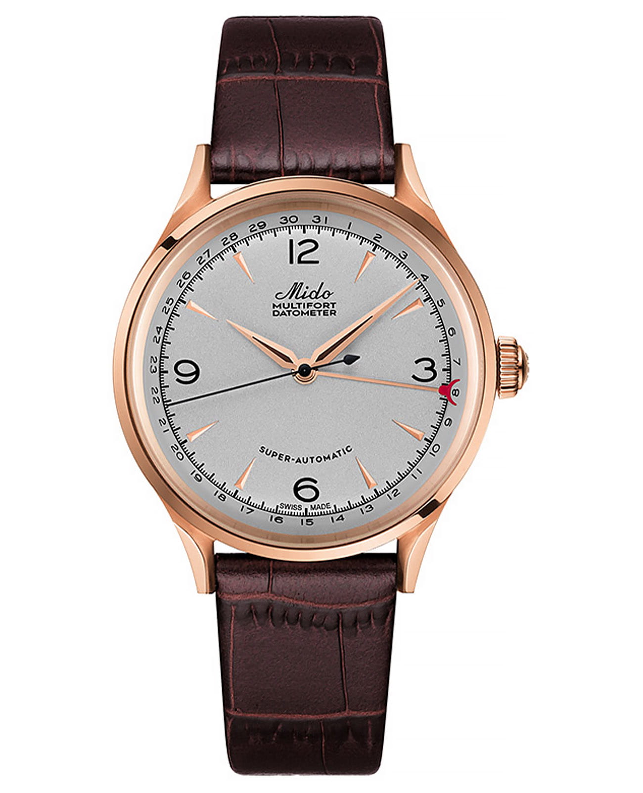 Multifort Datometer Limited Edition - лимитированный выпуск (1918 экземпляров), переиздание одноименной модели 1939-го года в честь векового юбилея марки Mido. Завинчивающаяся прозрачная задняя крышка. Запас хода до 80 часов. Мужские швейцарские механические часы (автоматический калибр) с высокой точностью. Сапфировое стеклоСапфировое стеклоПрочный и надёжный материал из кристалла сапфира синтетического происхождения, характеризующийся особой твёрдостью и устойчивостью к царапинам и повреждениям. устойчивое к появлению царапин, обладающее высокой прозрачностью. Класс водозащиты: 50 метров, защитит корпус от случайных брызг и капель дождя. Корпус часов изготовлен из стали с PVD-покрытиемPVDУльтратонкое покрытие наносится в технике вакуумного напыления, сочетает в себе нитрид титана особой прочности со слоем золота или оксида хрома. Несёт в себе декоративную или защитную функцию. .