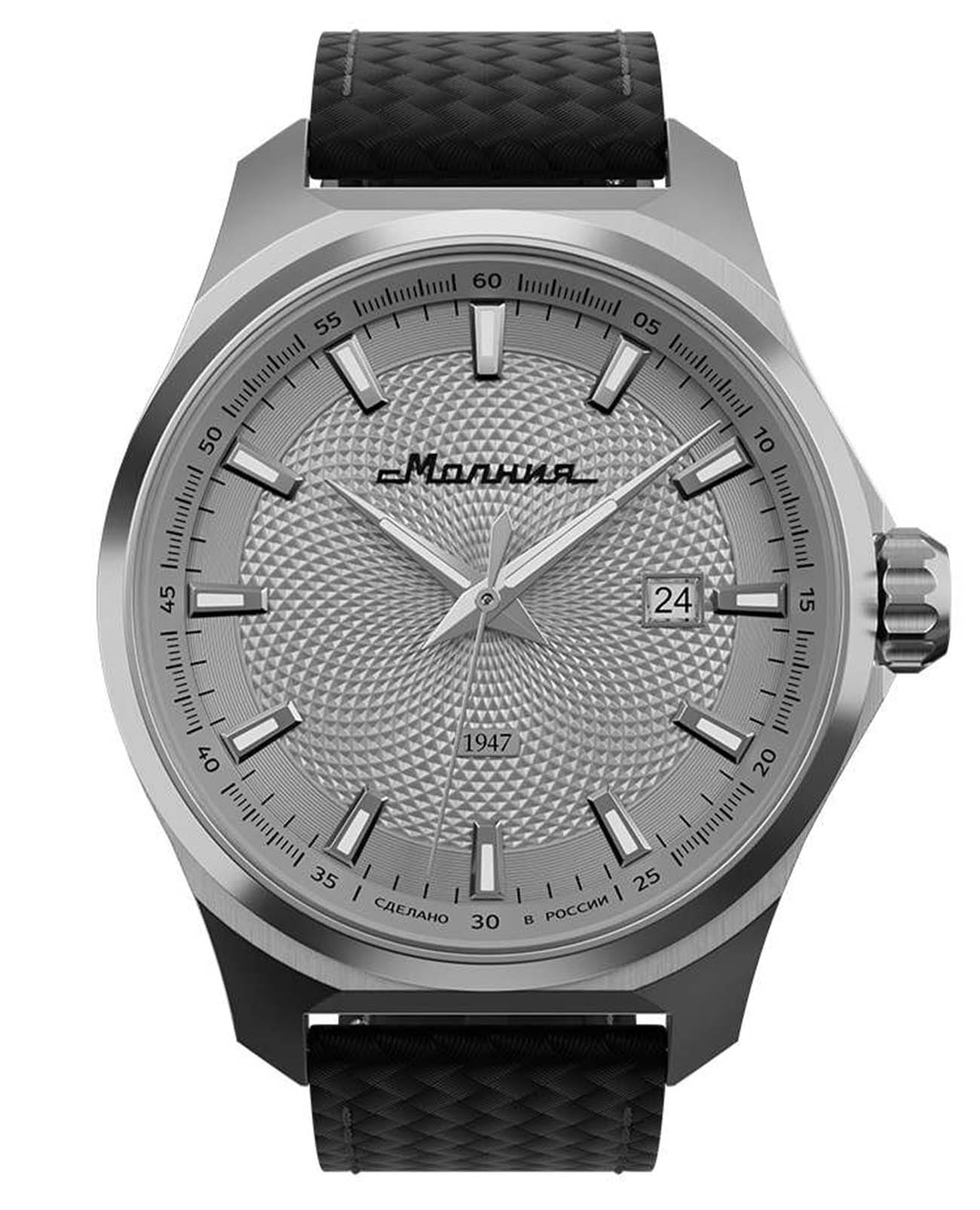 Мужские механические часы с автоподзаводом — это надёжный аксессуар от легендарного бренда «МОЛНИЯ», созданный на Челябинском часовом заводе. Корпус диаметром 42 мм выполнен из нержавеющей стали 316L с зеркальной полировкой. БезельБезельВнешний ободок, закрепляющий стекло. В спортивных часах так называется поворотное кольцо с делениями на циферблате, выполняет роль таймера – замеряет отрезки времени на шкале. Неподвижный безель – элемент декора. Однонаправленно вращающийся безель на дайверских часах позволяет фиксировать моменты погружения и выныривания на поверхность. также выполнен из стали с зеркальной отделкой. Циферблат серебристого цвета оформлен индексами и стрелками. Окошко даты расположено в положении 3 часов. Стрелки и метки с люминесцентным покрытиемЛюминесцентное покрытиеПозволяет считывать показания времени в темноте. Производители наносят на стрелки, часовые индексы, безель или поверхность циферблата светонакопительный состав, дающий холодное свечение. Super-LumiNova, обеспечивающим хорошую читаемость в темноте. Циферблат защищён сапфировым стекломСапфировое стеклоПрочный и надёжный материал из кристалла сапфира синтетического происхождения, характеризующийся особой твёрдостью и устойчивостью к царапинам и повреждениям. с антибликовым покрытиемАнтибликовое покрытиеСлой оксида металла в 0,13-0,3 микрон, благодаря которому стекло часов не бликует и не отражает свет. Антибликовое покрытие уменьшает отражение света в 10 раз, обеспечивая отличную читаемость показателей циферблата.. Механизм — японский автоматический калибр Miyota 8215 с функцией и запасом хода до 42 часов. Прозрачная задняя крышка позволяет наблюдать за работой механизма с кастомным ротором. Часы оснащены кожаным ремешком чёрного цвета с подкладкой из фтористого каучука и классической пряжкой, а также системой быстрой замены. Водонепроницаемость 100 м позволяет использовать часы для плавания и повседневного ношения. Идеальный выбор для тех, кто ценит качество, точность и стиль.
