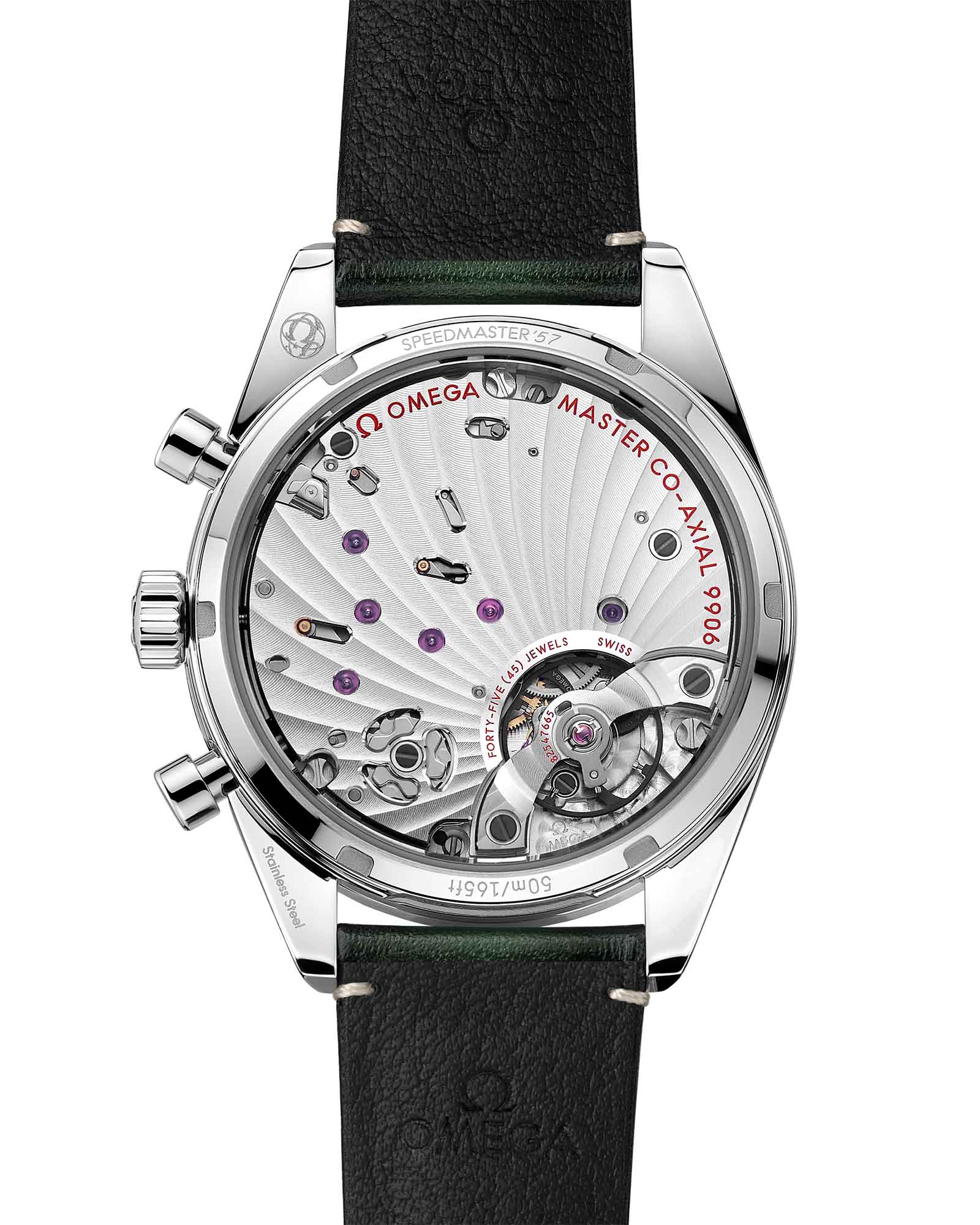 Speedmaster — это не просто часы, а живая легенда OMEGA, прошедшая через все шесть лунных миссий и ставшая олицетворением смелости человеческого духа. 40,5-миллиметровый корпус из нержавеющей стали, вдохновленный легендарным дизайном 1957 года, сочетается с глубоким черным циферблатом, где каждый элемент продуман до мелочей. Углубленные часовые метки, подсвеченные винтажным составом Super-LumiNova, создают неповторимый образ. Стрелки «Broad Arrow» с родиевым покрытием гармонично сочетаются с функциональными элементами: указателем даты на «6 часах», малой секундной стрелкой на «9 часах» и счетчиками хронографаХронографФункция позволяет измерять отрезки времени с особой точностью: часы, минуты, секунды. Верным признаком хронографа является наличие на циферблате 3 дополнительных окошек-счётчиков. на «3 часах». Сатинированный безельБезельВнешний ободок, закрепляющий стекло. В спортивных часах так называется поворотное кольцо с делениями на циферблате, выполняет роль таймера – замеряет отрезки времени на шкале. Неподвижный безель – элемент декора. Однонаправленно вращающийся безель на дайверских часах позволяет фиксировать моменты погружения и выныривания на поверхность. с черненой тахиметрической шкалой придает часам спортивный характер, а плоское сапфировое стеклоСапфировое стеклоПрочный и надёжный материал из кристалла сапфира синтетического происхождения, характеризующийся особой твёрдостью и устойчивостью к царапинам и повреждениям. задней крышки с антибликовым покрытием эффектно демонстрирует гравировку «Speedmaster '57». Внутри бьется сердце этих часов — калибр OMEGA Co-Axial Master Chronometer 9906 с ручным заводом, воплощающий в себе лучшие традиции часового искусства. Завершает образ ремешок из кожи зеленого цвета с застежкой, украшенной рельефным логотипом OMEGA.