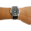 Минималистичный циферблат дополнен стильным узором. Модель оснащена японским автоматическим калибром Orient 46Е40 с запасом хода до 40 часов, противоударное устройство оси баланса обеспечивает лучшую защиту. Ремешок из натуральной кожи имеет рисунок под крокодиловую кожу. Стрелки и метки дополнены люминесцентной подсветкойЛюминесцентное покрытиеПозволяет считывать показания времени в темноте. Производители наносят на стрелки, часовые индексы, безель или поверхность циферблата светонакопительный состав, дающий холодное свечение.. Функции: отображение числа, дня недели.