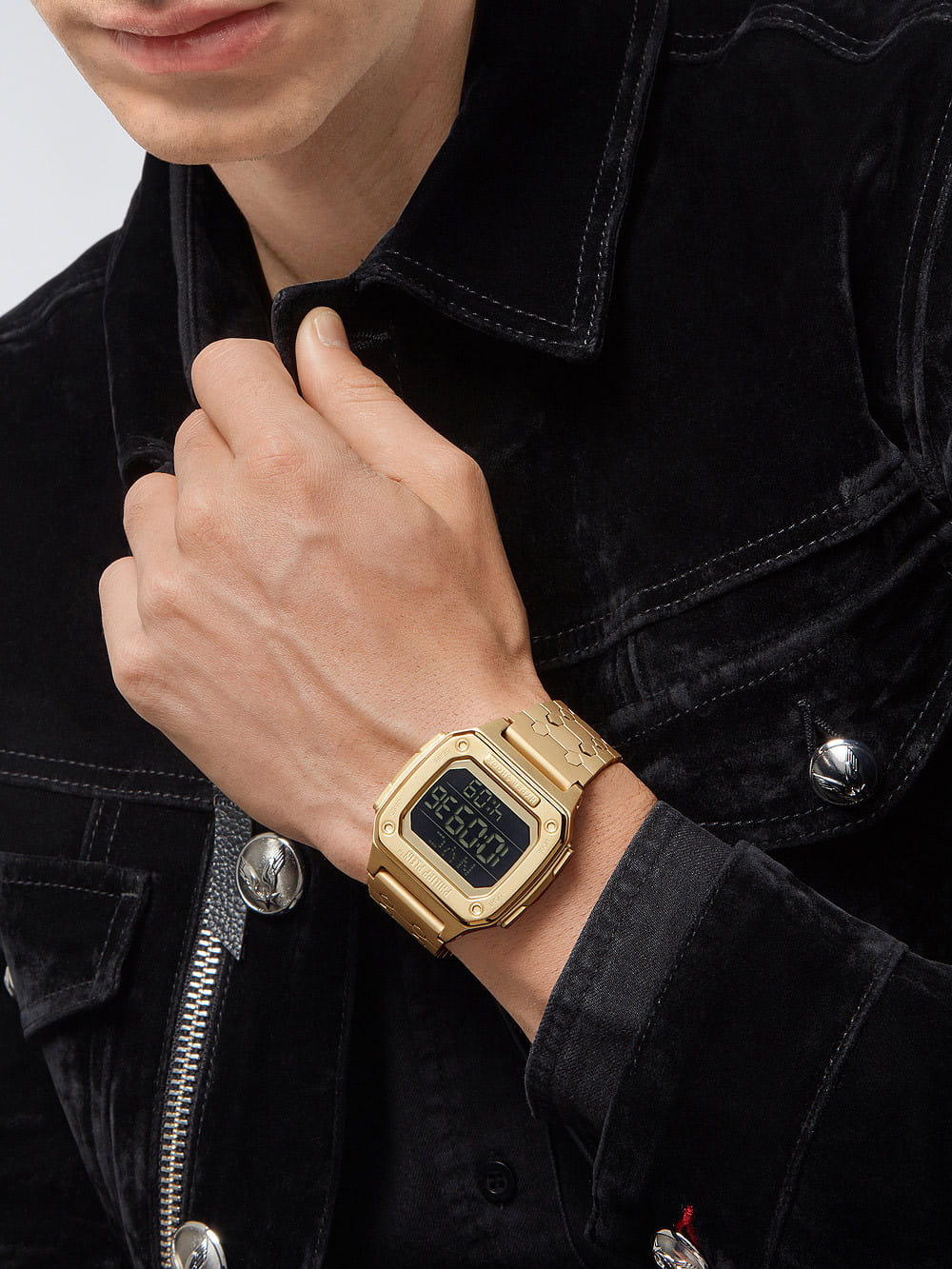 Электронные унисекс часы-хронографХронографФункция позволяет измерять отрезки времени с особой точностью: часы, минуты, секунды. Верным признаком хронографа является наличие на циферблате 3 дополнительных окошек-счётчиков. Philipp Plein Hyper Shock PWHAA0621, электронный механизм с высокой точностью. Класс водозащиты: 50 метров, позволит защитить корпус от случайных брызг или капель дождя. Прямоугольный корпус выполнен из нержавеющей стали с IP-покрытиемIP-покрытиеМетод ионного напыления. Демонстрирует повышенную устойчивость к истиранию, окислению и химическим веществам. Под воздействием высокого давления и температуры около 1500°C молекулы металла надёжно соединяются с частицами корпуса часов. золотистого цвета. Браслет из нержавеющей стали шириной 22 мм, застёжка «бабочка» с кнопкамиЗастёжка "бабочка"Такой вид застёжки дополняется предохранителями, помогающими избежать случайного раскрытия браслета. Обладают изящным исполнением. .