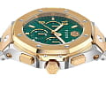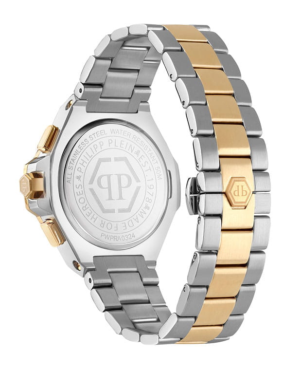Philipp Plein Plein Chrono Royal 46 MM PWPRA0324 - это дерзкие и бескомпромиссные часы, воплощающие бунтарский дух бренда. Диаметр корпуса из прочной нержавеющей стали равен 46 мм. Стальной браслет на застёжке-бабочке с кнопкамиЗастёжка "бабочка"Такой вид застёжки дополняется предохранителями, помогающими избежать случайного раскрытия браслета. Обладают изящным исполнением. обеспечивает надёжную фиксацию и комфортное ношение. Минеральное стеклоМинеральное стеклоМинеральное стекло представляет собой искусственно выращенный минерал кварца. Такое стекло отличается особой устойчивостью к повреждениям и царапинам. Уступает по некоторым качествам сапфировому стеклу. защищает циферблат от царапин. БезельБезельВнешний ободок, закрепляющий стекло. В спортивных часах так называется поворотное кольцо с делениями на циферблате, выполняет роль таймера – замеряет отрезки времени на шкале. Неподвижный безель – элемент декора. Однонаправленно вращающийся безель на дайверских часах позволяет фиксировать моменты погружения и выныривания на поверхность. с PVD-покрытиемPVDУльтратонкое покрытие наносится в технике вакуумного напыления, сочетает в себе нитрид титана особой прочности со слоем золота или оксида хрома. Несёт в себе декоративную или защитную функцию.. Функциональность хронографаХронографФункция позволяет измерять отрезки времени с особой точностью: часы, минуты, секунды. Верным признаком хронографа является наличие на циферблате 3 дополнительных окошек-счётчиков. позволяет точно измерять время, а надежный кварцевый механизм гарантирует безупречную работу. Люминесцентное покрытиеЛюминесцентное покрытиеПозволяет считывать показания времени в темноте. Производители наносят на стрелки, часовые индексы, безель или поверхность циферблата светонакопительный состав, дающий холодное свечение. стрелок и меток позволит следить за временем даже в полной темноте. Граненая заводная головка. Влагозащита: 50 метров, позволит защитить корпус от случайных брызг или капель дождя. Идеальный аксессуар для тех, кто ценит индивидуальность и не боится выделяться из толпы.