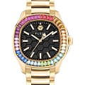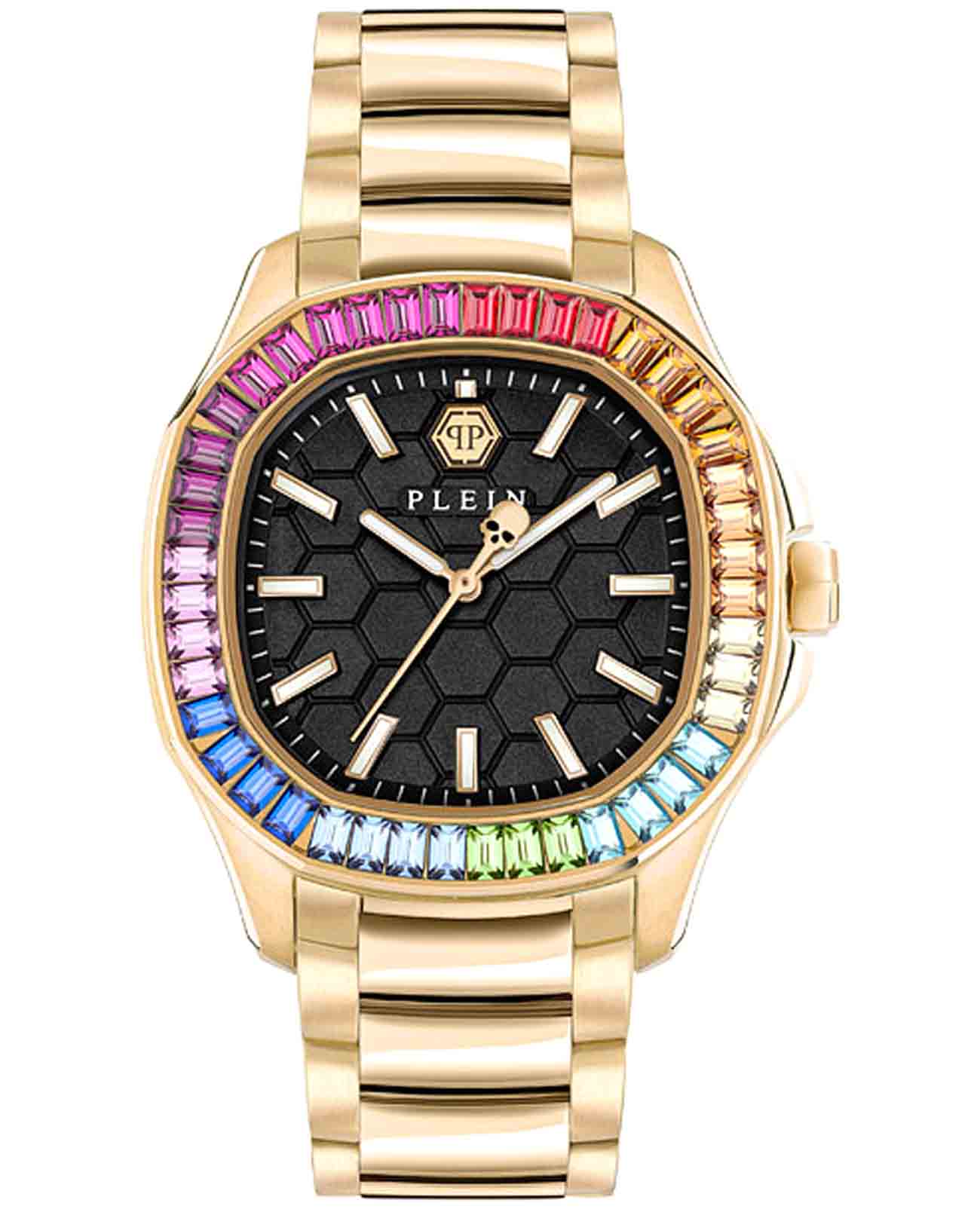 Philipp Plein THE $PECTRE LADY PWTAA1224 - дерзкое заявление любви к роскоши и бунтарскому стилю. Диаметр корпуса из прочной нержавеющей стали с PVD-покрытиемPVDУльтратонкое покрытие наносится в технике вакуумного напыления, сочетает в себе нитрид титана особой прочности со слоем золота или оксида хрома. Несёт в себе декоративную или защитную функцию. равен 38 мм. Стальной браслет на застёжке-бабочке с кнопкамиЗастёжка "бабочка"Такой вид застёжки дополняется предохранителями, помогающими избежать случайного раскрытия браслета. Обладают изящным исполнением. обеспечивает надёжную фиксацию и комфортное ношение. Минеральное стеклоМинеральное стеклоМинеральное стекло представляет собой искусственно выращенный минерал кварца. Такое стекло отличается особой устойчивостью к повреждениям и царапинам. Уступает по некоторым качествам сапфировому стеклу. защищает циферблат от царапин. Люминесцентное покрытиеЛюминесцентное покрытиеПозволяет считывать показания времени в темноте. Производители наносят на стрелки, часовые индексы, безель или поверхность циферблата светонакопительный состав, дающий холодное свечение. стрелок и меток позволит следить за временем даже в полной темноте. БезельБезельВнешний ободок, закрепляющий стекло. В спортивных часах так называется поворотное кольцо с делениями на циферблате, выполняет роль таймера – замеряет отрезки времени на шкале. Неподвижный безель – элемент декора. Однонаправленно вращающийся безель на дайверских часах позволяет фиксировать моменты погружения и выныривания на поверхность. инкрустирован кристаллами Preciosa. Влагозащита: 50 метров, позволит защитить корпус от случайных брызг или капель дождя. Идеальный аксессуар для тех, кто ценит индивидуальность и не боится выделяться из толпы.