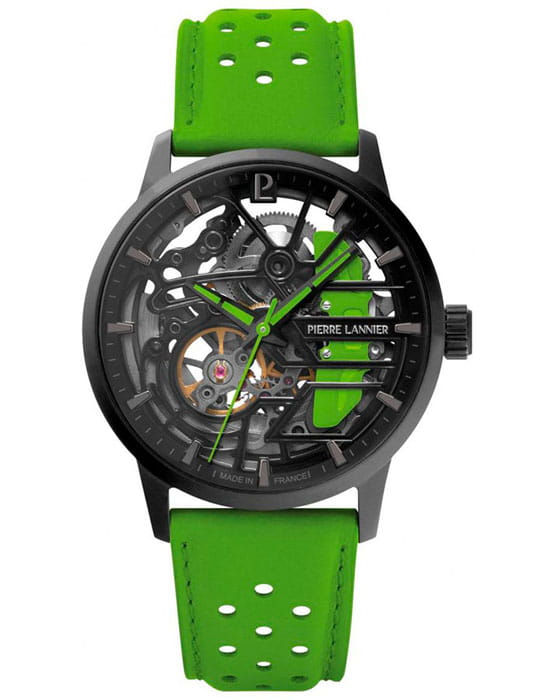Pierre Lannier Paddock 145G877 — элегантная модель с выразительным спортивным характером. Корпус диаметром 39 мм выполнен из нержавеющей стали с матовым PVD-покрытиемPVDУльтратонкое покрытие наносится в технике вакуумного напыления, сочетает в себе нитрид титана особой прочности со слоем золота или оксида хрома. Несёт в себе декоративную или защитную функцию., подчёркивающим технологичный стиль и динамику дизайна. Циферблат частично скелетонизирован, открывая механизм и баланс, что придаёт модели техническую выразительность. Часовые метки и стрелки покрыты люминесцентным покрытиемЛюминесцентное покрытиеПозволяет считывать показания времени в темноте. Производители наносят на стрелки, часовые индексы, безель или поверхность циферблата светонакопительный состав, дающий холодное свечение., обеспечивая хорошую читаемость в любых условиях. Циферблат защищён прочным минеральным стекломМинеральное стеклоМинеральное стекло представляет собой искусственно выращенный минерал кварца. Такое стекло отличается особой устойчивостью к повреждениям и царапинам. Уступает по некоторым качествам сапфировому стеклу., устойчивым к царапинам и повседневным воздействиям. Водонепроницаемость до 50 метров позволяет использовать часы в различных жизненных ситуациях без ограничений. Внутри — автоматический механизм с автоподзаводом и запасом хода около 42 часов, не требующий подзарядки при регулярном ношении. Ремешок из перфорированной кожи шириной 20 мм дополнен удобной стандартной застежкой, обеспечивающей комфорт и надёжную фиксацию. Paddock — гармоничное сочетание механики, изящества и современного дизайна, созданное для тех, кто ценит уверенность и индивидуальность в деталях.