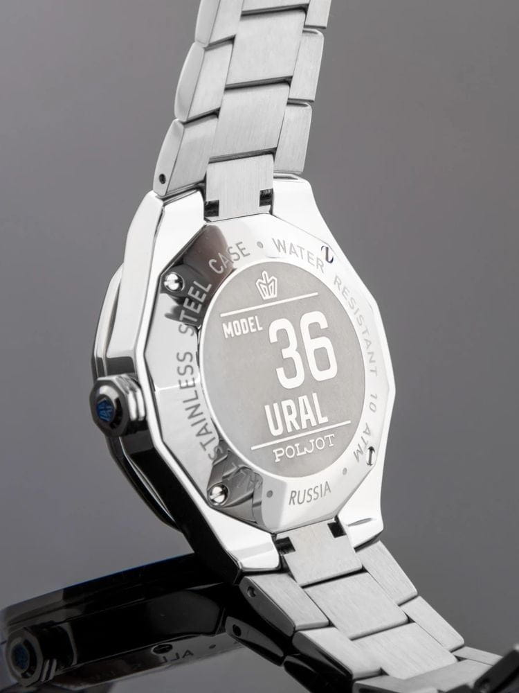 Poljot Ural 8215.361243Б — стильные механические часы с автоподзаводом, сочетающие брутальный характер и современную элегантность. Корпус и браслет выполнены из нержавеющей стали, что придаёт модели монолитность и прочность, а глубокий циферблат с фактурным геометрическим узором подчеркивает премиальный облик. Стальной браслет на застёжке-бабочке с кнопкамиЗастёжка "бабочка"Такой вид застёжки дополняется предохранителями, помогающими избежать случайного раскрытия браслета. Обладают изящным исполнением. . Внутри установлен надёжный японский механизм Miyota 8215, обеспечивающий точный ход и плавную работу стрелок. Широкие метки и стрелки с люминесцентным покрытиемЛюминесцентное покрытиеПозволяет считывать показания времени в темноте. Производители наносят на стрелки, часовые индексы, безель или поверхность циферблата светонакопительный состав, дающий холодное свечение. гарантируют превосходную читаемость в любое время суток, а окно даты добавляет удобства. Прочное минеральное стеклоМинеральное стеклоМинеральное стекло представляет собой искусственно выращенный минерал кварца. Такое стекло отличается особой устойчивостью к повреждениям и царапинам. Уступает по некоторым качествам сапфировому стеклу. защищает циферблат от повреждений, а водонепроницаемость до 10 бар делает часы надёжным спутником как в деловом, так и активном образе жизни. Poljot Ural — воплощение силы, точности и мужского стиля, созданное для тех, кто ценит механику и уверенность в каждой детали.