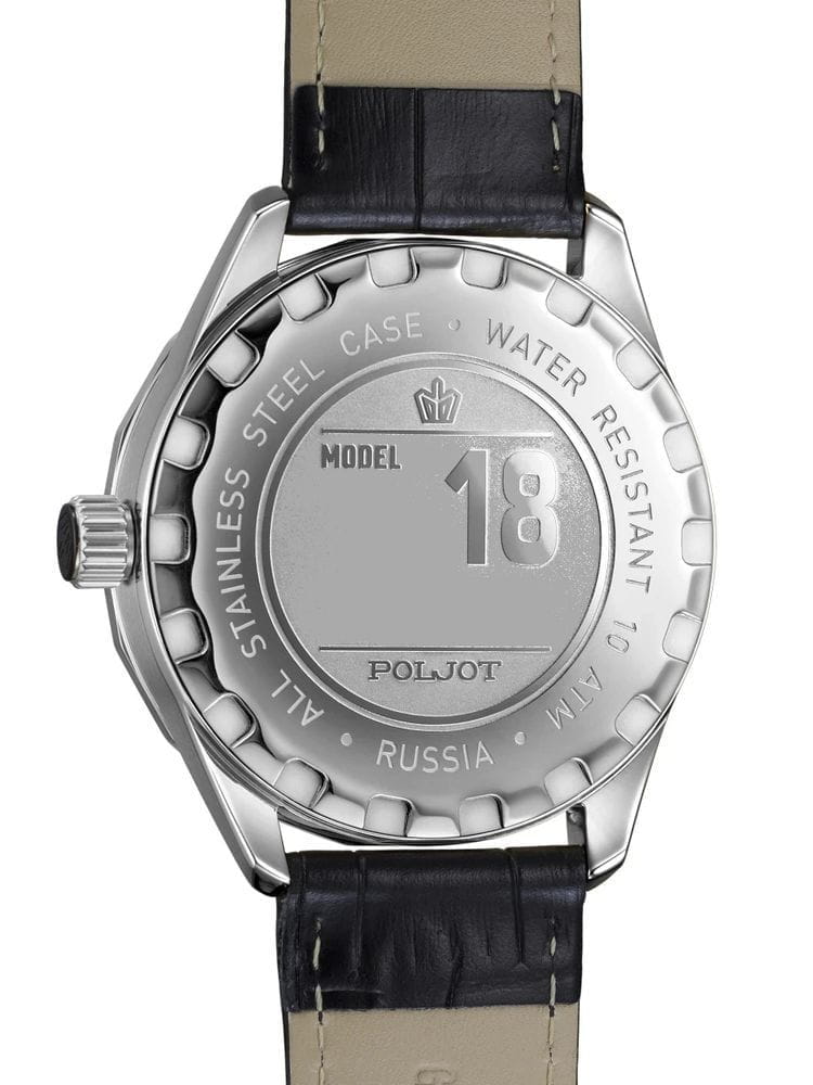 Poljot NH35A.181262 — надёжные механические мужские часы с автоподзаводом, сочетающие техническую точность и выразительный спортивный стиль. Корпус из нержавеющей стали подчёркивает прочность конструкции, а насыщенный циферблат с акцентами на стрелках и метках придаёт модели динамичный и современный облик. БезельБезельВнешний ободок, закрепляющий стекло. В спортивных часах так называется поворотное кольцо с делениями на циферблате, выполняет роль таймера – замеряет отрезки времени на шкале. Неподвижный безель – элемент декора. Однонаправленно вращающийся безель на дайверских часах позволяет фиксировать моменты погружения и выныривания на поверхность. с PVD-покрытиемPVDУльтратонкое покрытие наносится в технике вакуумного напыления, сочетает в себе нитрид титана особой прочности со слоем золота или оксида хрома. Несёт в себе декоративную или защитную функцию.. Внутри установлен проверенный японский механизм SEIKO NH35, обеспечивающий стабильную работу и плавный ход секундной стрелки. Окно даты добавляет функциональности, а широкие метки с люминесцентным покрытиемЛюминесцентное покрытиеПозволяет считывать показания времени в темноте. Производители наносят на стрелки, часовые индексы, безель или поверхность циферблата светонакопительный состав, дающий холодное свечение. обеспечивают отличную читаемость даже в темноте. Прочное минеральное стеклоМинеральное стеклоМинеральное стекло представляет собой искусственно выращенный минерал кварца. Такое стекло отличается особой устойчивостью к повреждениям и царапинам. Уступает по некоторым качествам сапфировому стеклу. защищает циферблат от царапин, а ремешок из натуральной кожи с контрастной прострочкой гарантирует комфорт и надёжную посадку. Poljot — часы с характером, созданные для тех, кто ценит точность, качество и спортивную уверенность в каждой детали.
