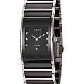 Женские часы Rado Integral R20785752 с надёжным кварцевым механизмом. Сапфировое стеклоСапфировое стеклоПрочный и надёжный материал из кристалла сапфира синтетического происхождения, характеризующийся особой твёрдостью и устойчивостью к царапинам и повреждениям. устойчивое к мелким механическим повреждениям. Корпус выполнен из нержавеющей стали. Класс водозащиты: 30 метров, позволит защитить корпус от случайных брызг или капель дождя. Циферблат декорирован 6 бриллиантами. Стальной браслет с вставками из высокотехнологичной керамикиВысокотехнологичная керамикаИнновационный запатентованный Rado материал с гладкой или матовой поверхностью. Керамика за счёт кристаллической структуры обладает повышенной устойчивостью от возникновения царапин. Материал способен принимать температуру тела человека, обеспечивая невероятный комфорт при ношении. на раскладной застёжкеРаскладная застёжкаТакой тип застёжки используется только на браслетах из металла. Она никогда не раскрывается полностью, происходит разделение на 2 и более частей. Раскладывающая застёжка снизит вероятность потери часов к минимуму.. Отображение даты в положении «6 часов».