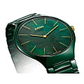 Оригинальный аксессуар в зелёном цвете имеет оригинальный циферблат с изображением листа, сквозь которого пробиваются лучи солнца, модель олицетворяет символы гармоничной природы. Моноблочный корпус и безельБезельВнешний ободок, закрепляющий стекло. В спортивных часах так называется поворотное кольцо с делениями на циферблате, выполняет роль таймера – замеряет отрезки времени на шкале. Неподвижный безель – элемент декора. Однонаправленно вращающийся безель на дайверских часах позволяет фиксировать моменты погружения и выныривания на поверхность. изготовлены из сочетания нержавеющей стали 316L с PVD-покрытиемPVDУльтратонкое покрытие наносится в технике вакуумного напыления, сочетает в себе нитрид титана особой прочности со слоем золота или оксида хрома. Несёт в себе декоративную или защитную функцию. и высокотехнологичной керамикиВысокотехнологичная керамикаИнновационный запатентованный Rado материал с гладкой или матовой поверхностью. Керамика за счёт кристаллической структуры обладает повышенной устойчивостью от возникновения царапин. Материал способен принимать температуру тела человека, обеспечивая невероятный комфорт при ношении.. Кварцевый калибр ETA 282.001 с высокой точностью хода. Антибликовая обработка сапфирового стекла. Водонепроницаемость до 3 бар. . Диаметр корпуса: 39 мм.
