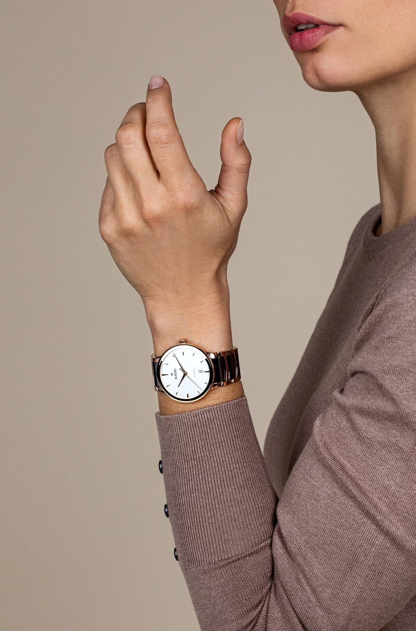 Швейцарские механические часы с автоматическим подзаводом Rado Centrix Automatic R30017012. Корпус часов изготовлен из нержавеющей стали с PVD-покрытиемPVDУльтратонкое покрытие наносится в технике вакуумного напыления, сочетает в себе нитрид титана особой прочности со слоем золота или оксида хрома. Несёт в себе декоративную или защитную функцию.. Браслет из стали и высокотехнологичной керамикиВысокотехнологичная керамикаИнновационный запатентованный Rado материал с гладкой или матовой поверхностью. Керамика за счёт кристаллической структуры обладает повышенной устойчивостью от возникновения царапин. Материал способен принимать температуру тела человека, обеспечивая невероятный комфорт при ношении. на раскладной застёжкеРаскладная застёжкаТакой тип застёжки используется только на браслетах из металла. Она никогда не раскрывается полностью, происходит разделение на 2 и более частей. Раскладывающая застёжка снизит вероятность потери часов к минимуму.. Сапфировое стеклоСапфировое стеклоПрочный и надёжный материал из кристалла сапфира синтетического происхождения, характеризующийся особой твёрдостью и устойчивостью к царапинам и повреждениям. устойчивое к мелким механическим повреждениям. Класс водозащиты: 50 метров, позволит защитить корпус от случайных брызг или капель дождя. Окошко даты находится в положении 6 часов.