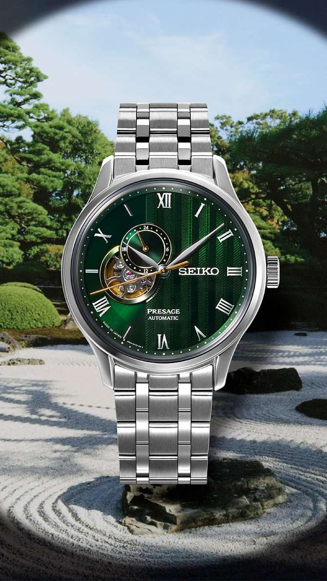 Модель Seiko SSA463J1 из коллекции Presage Japanese Garden — это элегантные автоматические часы, вдохновлённые эстетикой японских садов и философией дзен. Корпус диаметром 41,8 мм выполнен из нержавеющей стали с комбинированной полировкой и прозрачной задней крышкой. Водозащита составляет 30 метров — оптимально для повседневной носки. Фиксированный стальной безельБезельВнешний ободок, закрепляющий стекло. В спортивных часах так называется поворотное кольцо с делениями на циферблате, выполняет роль таймера – замеряет отрезки времени на шкале. Неподвижный безель – элемент декора. Однонаправленно вращающийся безель на дайверских часах позволяет фиксировать моменты погружения и выныривания на поверхность. подчёркивает гармоничные формы корпуса. Циферблат насыщенного зелёного цвета с тонкой текстурой напоминает волны гравия в японском саду. Открытое окно «open heart» на 9 часах позволяет наблюдать за работой механизма. В верхней части расположен индикатор запаса ходаШагомерШагоме́р или педо́метр — измерительный прибор для подсчёта количества сделанных шагов (или пар шагов) при ходьбе или беге.. Циферблат защищён двойным выпуклым сапфировым стекломСапфировое стеклоПрочный и надёжный материал из кристалла сапфира синтетического происхождения, характеризующийся особой твёрдостью и устойчивостью к царапинам и повреждениям. с внутренним антибликовым покрытиемАнтибликовое покрытиеСлой оксида металла в 0,13-0,3 микрон, благодаря которому стекло часов не бликует и не отражает свет. Антибликовое покрытие уменьшает отражение света в 10 раз, обеспечивая отличную читаемость показателей циферблата., устойчивым к царапинам и бликам. Внутри установлен автоматический калибр Seiko 4R39 с ручным подзаводом, функцией остановки секундной стрелки и запасом хода до 41 часа. Браслет выполнен из нержавеющей стали и оснащён удобной застёжкой «бабочка» с кнопкамиЗастёжка "бабочка"Такой вид застёжки дополняется предохранителями, помогающими избежать случайного раскрытия браслета. Обладают изящным исполнением. . Seiko SARY237 — это стильное и сбалансированное решение для ценителей классики с японским характером, где сочетаются глубокий дизайн и надёжная механика.