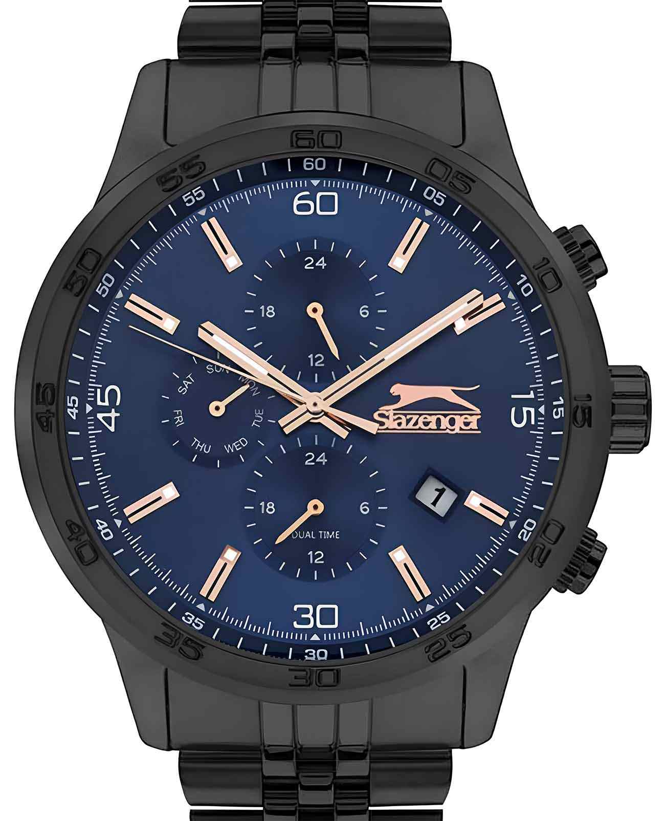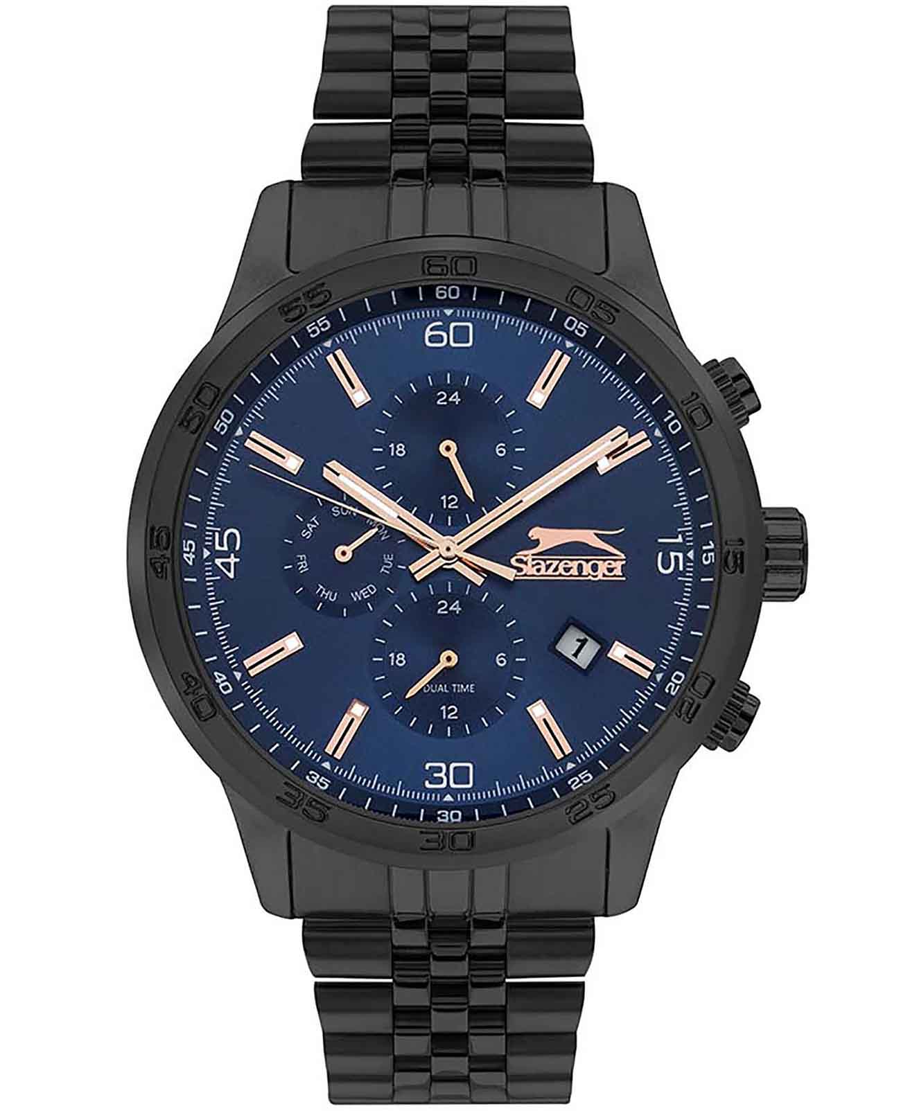 Часы Slazenger SL.09.2055.2.04 представляют собой стильное и функциональное дополнение к вашему образу. Их синий циферблат и корпус с безелемБезельВнешний ободок, закрепляющий стекло. В спортивных часах так называется поворотное кольцо с делениями на циферблате, выполняет роль таймера – замеряет отрезки времени на шкале. Неподвижный безель – элемент декора. Однонаправленно вращающийся безель на дайверских часах позволяет фиксировать моменты погружения и выныривания на поверхность. из суперметалла с IP-покрытиемIP-покрытиеМетод ионного напыления. Демонстрирует повышенную устойчивость к истиранию, окислению и химическим веществам. Под воздействием высокого давления и температуры около 1500°C молекулы металла надёжно соединяются с частицами корпуса часов. создают элегантный и современный вид, который подчеркнет вашу индивидуальность. Эти мужские часы оснащены кварцевым механизмом, обеспечивающим точность хода. Минеральное стеклоМинеральное стеклоМинеральное стекло представляет собой искусственно выращенный минерал кварца. Такое стекло отличается особой устойчивостью к повреждениям и царапинам. Уступает по некоторым качествам сапфировому стеклу. защищает циферблат от царапин, а люминесцентное покрытиеЛюминесцентное покрытиеПозволяет считывать показания времени в темноте. Производители наносят на стрелки, часовые индексы, безель или поверхность циферблата светонакопительный состав, дающий холодное свечение. на стрелках и метках позволяют легко считывать время даже в темноте. Функциональность часов дополнена вторым часовым поясомВторой часовой поясФункция, позволяющая отображать время двух часовых поясов одновременно., 24-часовым указателем времени, календарем даты в районе 4 часа и дня недели. Черный браслет из суперметалла с IP-покрытиемIP-покрытиеМетод ионного напыления. Демонстрирует повышенную устойчивость к истиранию, окислению и химическим веществам. Под воздействием высокого давления и температуры около 1500°C молекулы металла надёжно соединяются с частицами корпуса часов. и с раскладной застёжкойРаскладная застёжкаТакой тип застёжки используется только на браслетах из металла. Она никогда не раскрывается полностью, происходит разделение на 2 и более частей. Раскладывающая застёжка снизит вероятность потери часов к минимуму. гармонично дополняет общий дизайн. Размер корпуса составляет 45 мм в диаметре и 11,5 мм в толщину, что делает их удобными для повседневного ношения. А водозащита уровня 5 ATM делает их надежными спутниками даже в условиях повышенной влажности.