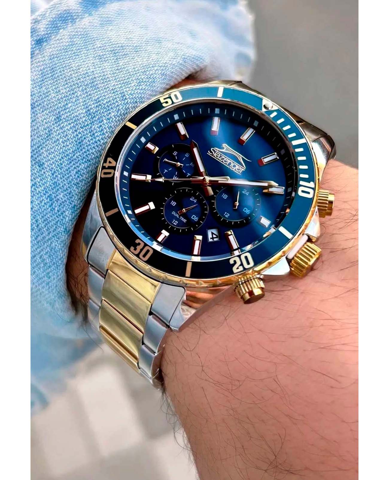 Мужские наручные часы Slazenger SL.09.2091.2.02 сочетают в себе классический дизайн и надежность современных технологий. Модель обладает круглым корпусом диаметром 44 мм, изготовленным из суперметалла, что обеспечивает высокую устойчивость к внешним воздействиям. БезельБезельВнешний ободок, закрепляющий стекло. В спортивных часах так называется поворотное кольцо с делениями на циферблате, выполняет роль таймера – замеряет отрезки времени на шкале. Неподвижный безель – элемент декора. Однонаправленно вращающийся безель на дайверских часах позволяет фиксировать моменты погружения и выныривания на поверхность. с IP-покрытиемIP-покрытиеМетод ионного напыления. Демонстрирует повышенную устойчивость к истиранию, окислению и химическим веществам. Под воздействием высокого давления и температуры около 1500°C молекулы металла надёжно соединяются с частицами корпуса часов., добавляя модели элегантности и защищая поверхность от повреждений. Браслет выполнен из суперметалла с частичным IP-покрытиемIP-покрытиеМетод ионного напыления. Демонстрирует повышенную устойчивость к истиранию, окислению и химическим веществам. Под воздействием высокого давления и температуры около 1500°C молекулы металла надёжно соединяются с частицами корпуса часов. цвета желтого золота с раскладной застежкойРаскладной замокДанный вариант застежки используется только на часах с металлическим браслетом. Отличительная особенность такого крепления в том, что длина браслета становится универсальной и вы можете самостоятельно отрегулировать нужный вам размер – застежка просто двигается по браслету часов., гарантирующей комфортное ношение и безопасность. Циферблат темно-синего цвета выполнен по технологии Sunray (солнечные лучи), декорирован индексами в виде штрихов и логотипом бренда, а стрелки имеют люминесцентное покрытиеЛюминесцентное покрытиеПозволяет считывать показания времени в темноте. Производители наносят на стрелки, часовые индексы, безель или поверхность циферблата светонакопительный состав, дающий холодное свечение., обеспечивающее читаемость времени даже при недостаточной освещенности. Для защиты используется минеральное стеклоМинеральное стеклоМинеральное стекло представляет собой искусственно выращенный минерал кварца. Такое стекло отличается особой устойчивостью к повреждениям и царапинам. Уступает по некоторым качествам сапфировому стеклу., обеспечивающее прочную защиту от царапин. Часы работают на кварцевом механизме, что гарантирует точное время без необходимости подзаводки, и оснащены функцией второго часового поясаВторой часовой поясФункция, позволяющая отображать время двух часовых поясов одновременно., делая их практичными для путешествий. Водонепроницаемость часов достигает 5 атмосфер (WR50), что позволяет использовать их во время плавания, однако они не предназначены для дайвинга или других водных видов спорта. Толщина модели составляет 12 мм, а производитель предоставляет гарантию сроком 12 месяцев. SL.09.2091.2.02 — это стильный аксессуар, который станет отличным дополнением как формального, так и casual образа мужчины.