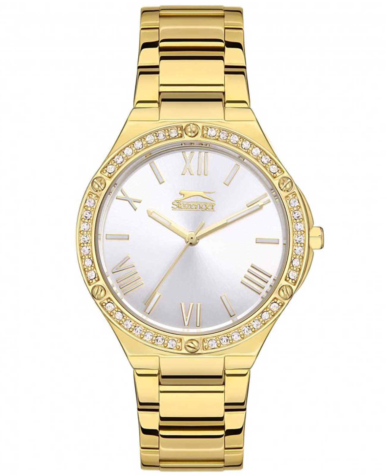 Женские часы Slazenger SL.09.2141.3.04 - это изысканный аксессуар, сочетающий в себе элегантность и функциональность. Модель оснащена надежным кварцевым механизмом и обладает водозащитой 3 АТМ, что позволяет не беспокоиться о случайных брызгах. Корпус часов диаметром 35 мм и толщиной 9 мм выполнен из прочного суперметалла с IP-покрытиемIP-покрытиеМетод ионного напыления. Демонстрирует повышенную устойчивость к истиранию, окислению и химическим веществам. Под воздействием высокого давления и температуры около 1500°C молекулы металла надёжно соединяются с частицами корпуса часов., а циферблат защищен минеральным стекломМинеральное стеклоМинеральное стекло представляет собой искусственно выращенный минерал кварца. Такое стекло отличается особой устойчивостью к повреждениям и царапинам. Уступает по некоторым качествам сапфировому стеклу.. БезельБезельВнешний ободок, закрепляющий стекло. В спортивных часах так называется поворотное кольцо с делениями на циферблате, выполняет роль таймера – замеряет отрезки времени на шкале. Неподвижный безель – элемент декора. Однонаправленно вращающийся безель на дайверских часах позволяет фиксировать моменты погружения и выныривания на поверхность. инкрустирован фианитами.  Браслет, также изготовленный из суперметалла с IP-покрытиемIP-покрытиеМетод ионного напыления. Демонстрирует повышенную устойчивость к истиранию, окислению и химическим веществам. Под воздействием высокого давления и температуры около 1500°C молекулы металла надёжно соединяются с частицами корпуса часов., имеет раскладную застёжкуРаскладная застёжкаТакой тип застёжки используется только на браслетах из металла. Она никогда не раскрывается полностью, происходит разделение на 2 и более частей. Раскладывающая застёжка снизит вероятность потери часов к минимуму., что подчеркивает современный стиль и позволяет легко снимать часы. Особую привлекательность часам придают декоративные элементы в виде фианитов. Весом всего 90 грамм, эти часы станут легким и стильным дополнением к любому образу.