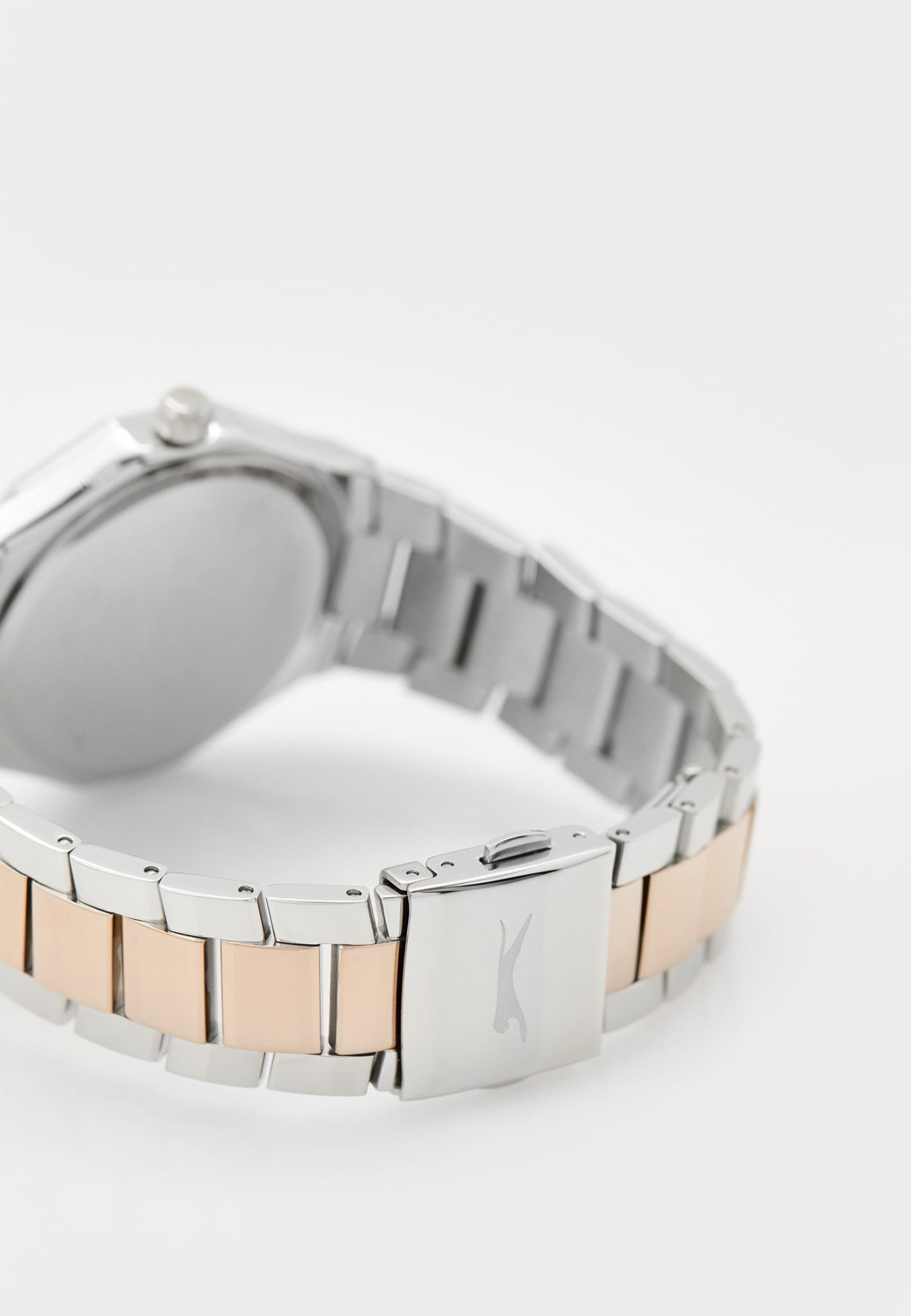 Часы Slazenger SL.09.2258.3.02 — это изысканный аксессуар, который гармонично подчеркнёт ваш индивидуальный стиль. Корпус и браслет выполнены из инновационного суперметалла — сплава на основе меди с пониженным содержанием цинка и никеля, обладающего специальным защитным покрытием, а циферблат украшен 4 кристаллами. Надёжный кварцевый механизм обеспечивает точный ход, а прочное минеральное стеклоМинеральное стеклоМинеральное стекло представляет собой искусственно выращенный минерал кварца. Такое стекло отличается особой устойчивостью к повреждениям и царапинам. Уступает по некоторым качествам сапфировому стеклу. устойчиво к царапинам и защищает перламутровый циферблат от внешних воздействий. Диаметр корпуса составляет 38 мм, толщина — всего 8 мм, что делает модель элегантной и удобной для ежедневного ношения. Водонепроницаемость до 3 бар позволяет не беспокоиться о случайных брызгах или каплях дождя. Стрелки с люминесцентным покрытиемЛюминесцентное покрытиеПозволяет считывать показания времени в темноте. Производители наносят на стрелки, часовые индексы, безель или поверхность циферблата светонакопительный состав, дающий холодное свечение. удобно подсвечиваются в темноте после зарядки на свету. Стальной браслет с частичным розово-золотистым IP-покрытиемIP-покрытиеМетод ионного напыления. Демонстрирует повышенную устойчивость к истиранию, окислению и химическим веществам. Под воздействием высокого давления и температуры около 1500°C молекулы металла надёжно соединяются с частицами корпуса часов. и раскладной застёжкойРаскладная застёжкаТакой тип застёжки используется только на браслетах из металла. Она никогда не раскрывается полностью, происходит разделение на 2 и более частей. Раскладывающая застёжка снизит вероятность потери часов к минимуму. обеспечивает комфортную посадку. Часы станут отличным выбором как для повседневной жизни, так и для особых случаев, а также послужат прекрасным подарком на любой праздник.