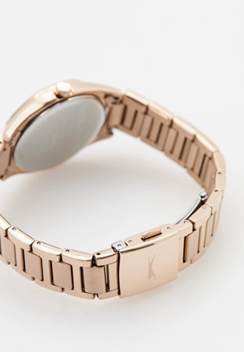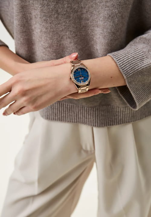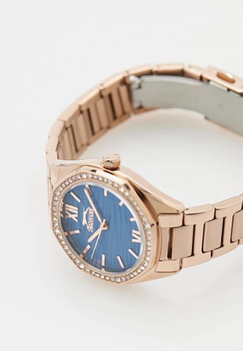 Женские кварцевые часы Slazenger SL.09.2301.3.02 — это элегантный и изысканный аксессуар, подчеркивающий стиль и утончённость. Корпус и браслет выполнены из суперметалла с IP-покрытиемIP-покрытиеМетод ионного напыления. Демонстрирует повышенную устойчивость к истиранию, окислению и химическим веществам. Под воздействием высокого давления и температуры около 1500°C молекулы металла надёжно соединяются с частицами корпуса часов., защищён минеральным стекломМинеральное стеклоМинеральное стекло представляет собой искусственно выращенный минерал кварца. Такое стекло отличается особой устойчивостью к повреждениям и царапинам. Уступает по некоторым качествам сапфировому стеклу.. Циферблат синего цвета с волнистым рельефным рисунком оформлен штриховыми метками и римскими цифрами VI и XII, дополнен логотипом бренда. Безель гранёный, украшен паве из фианитов, придающих модели изысканное сияние. Заводная головка — граненая, добавляющая детали дизайна. Браслет из суперметалла фиксируется на раскладной застёжкеРаскладная застёжкаТакой тип застёжки используется только на браслетах из металла. Она никогда не раскрывается полностью, происходит разделение на 2 и более частей. Раскладывающая застёжка снизит вероятность потери часов к минимуму., обеспечивая надёжность и комфорт ношения. Водонепроницаемость 30 м позволяет использовать часы в повседневных условиях, защищая от случайных брызг и капель дождя. Модель идеально подходит как для повседневного, так и для торжественного образа.