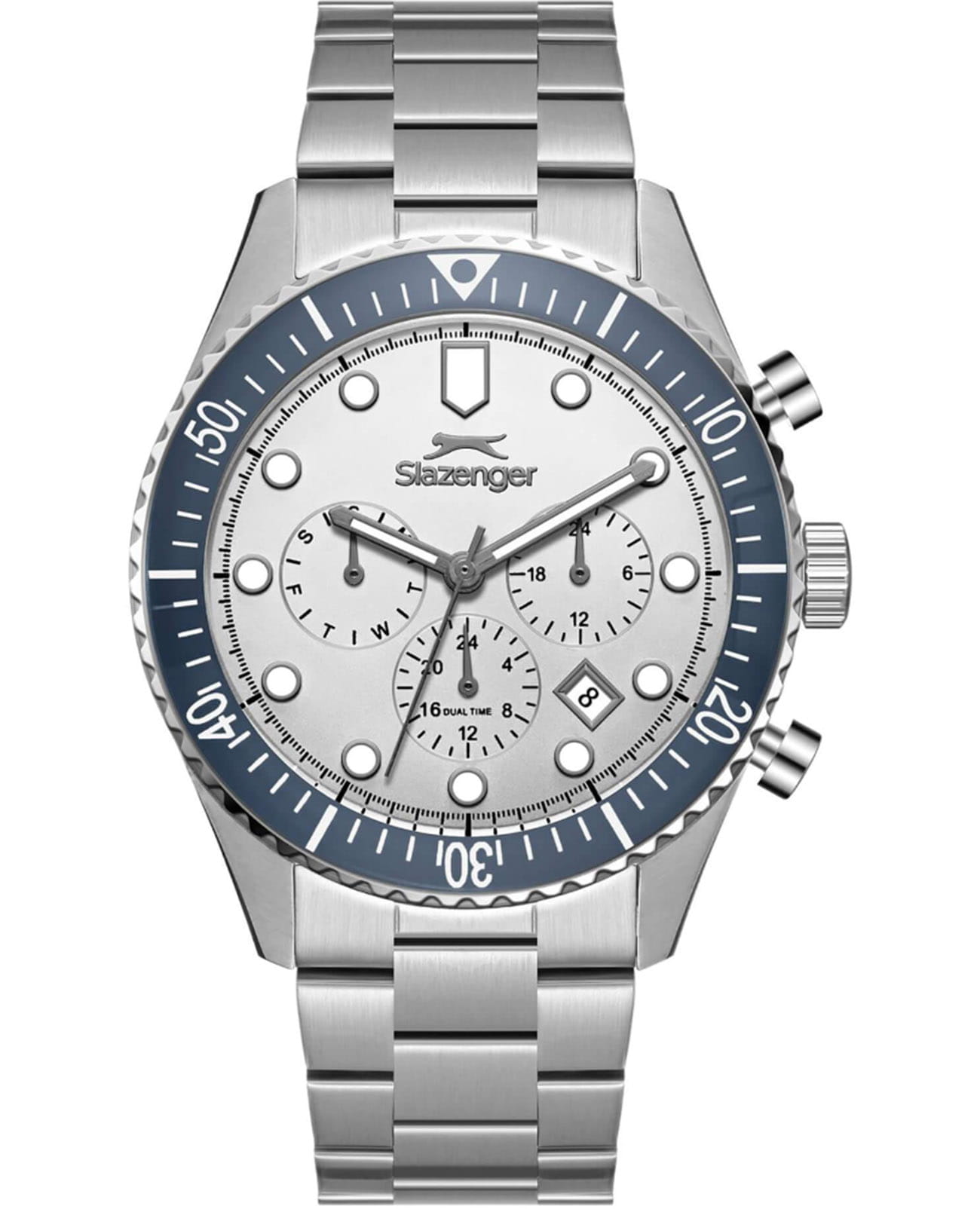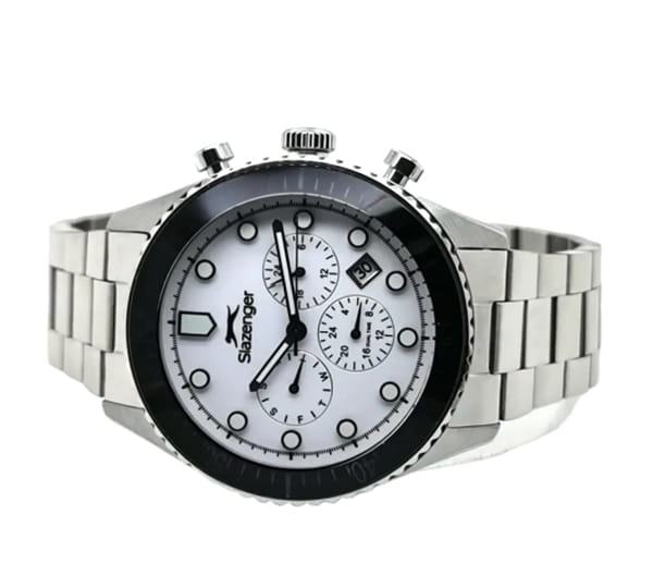 Мужские кварцевые часы Slazenger — это выразительный и функциональный аксессуар. Корпус диаметром 43 мм и толщиной 12 мм выполнен из нержавеющей стали 316L. Циферблат белого цвета оформлен индексами и стрелками. Циферблат защищён минеральным стекломМинеральное стеклоМинеральное стекло представляет собой искусственно выращенный минерал кварца. Такое стекло отличается особой устойчивостью к повреждениям и царапинам. Уступает по некоторым качествам сапфировому стеклу.. Механизм — кварцевый. Часы оснащены индикацией дня недели, даты, 12/24-часового формата времени и функцией второго часового пояса (GMT)Второй часовой поясФункция, позволяющая отображать время двух часовых поясов одновременно.. Окошко даты расположено между 4 и 5 часами. Стрелки и метки с люминесцентным покрытиемЛюминесцентное покрытиеПозволяет считывать показания времени в темноте. Производители наносят на стрелки, часовые индексы, безель или поверхность циферблата светонакопительный состав, дающий холодное свечение., обеспечивающим хорошую читаемость в темноте. БезельБезельВнешний ободок, закрепляющий стекло. В спортивных часах так называется поворотное кольцо с делениями на циферблате, выполняет роль таймера – замеряет отрезки времени на шкале. Неподвижный безель – элемент декора. Однонаправленно вращающийся безель на дайверских часах позволяет фиксировать моменты погружения и выныривания на поверхность. с IP-покрытиемIP-покрытиеМетод ионного напыления. Демонстрирует повышенную устойчивость к истиранию, окислению и химическим веществам. Под воздействием высокого давления и температуры около 1500°C молекулы металла надёжно соединяются с частицами корпуса часов.. Часы оснащены стальным браслетом с раскладной застёжкойРаскладная застёжкаТакой тип застёжки используется только на браслетах из металла. Она никогда не раскрывается полностью, происходит разделение на 2 и более частей. Раскладывающая застёжка снизит вероятность потери часов к минимуму.. Водонепроницаемость 100 м позволяет использовать часы для плавания и повседневного ношения. Гарантия — 12 месяцев. Идеальный выбор для тех, кто ценит стиль, функциональность и качество.