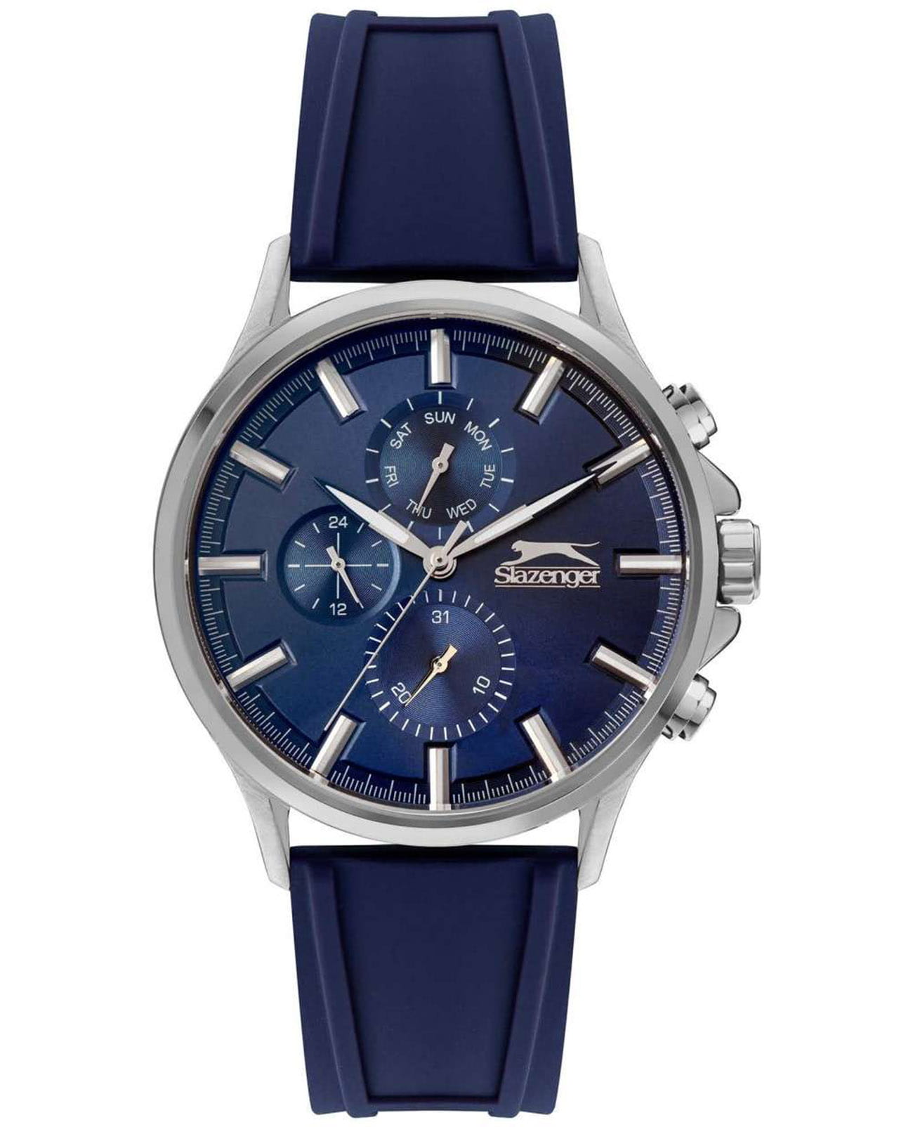 Мужские кварцевые часы Slazenger — это выразительный и функциональный аксессуар. Корпус диаметром 47 мм и толщиной 15 мм выполнен из суперметалла. Циферблат синего цвета оформлен индексами, стрелками и тремя вынесенными субциферблатами: для отображения дня недели, даты и 24-часового формата времени. Стрелки с люминесцентным покрытиемЛюминесцентное покрытиеПозволяет считывать показания времени в темноте. Производители наносят на стрелки, часовые индексы, безель или поверхность циферблата светонакопительный состав, дающий холодное свечение., обеспечивающим читаемость в темноте. Циферблат защищён минеральным стекломМинеральное стеклоМинеральное стекло представляет собой искусственно выращенный минерал кварца. Такое стекло отличается особой устойчивостью к повреждениям и царапинам. Уступает по некоторым качествам сапфировому стеклу.. Часы оснащены силиконовым ремешком на классической пряжке. Водонепроницаемость 50 м позволяет использовать часы в повседневных условиях. Идеальный выбор для тех, кто ценит стиль и качество.