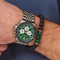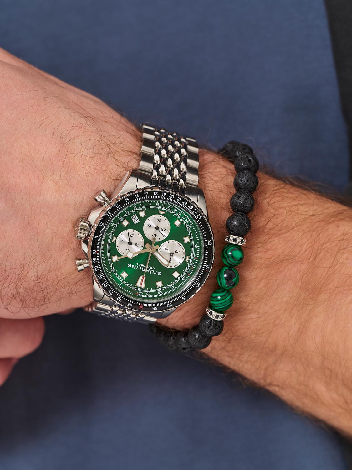 Stuhrling 1010.05 — мощные мужские часы с выразительным спортивным характером и динамичным дизайном. Корпус из нержавеющей стали гармонично сочетается с циферблатом, оформленным рельефным узором и контрастными счётчиками хронографаХронографФункция позволяет измерять отрезки времени с особой точностью: часы, минуты, секунды. Верным признаком хронографа является наличие на циферблате 3 дополнительных окошек-счётчиков.. Широкий безельБезельВнешний ободок, закрепляющий стекло. В спортивных часах так называется поворотное кольцо с делениями на циферблате, выполняет роль таймера – замеряет отрезки времени на шкале. Неподвижный безель – элемент декора. Однонаправленно вращающийся безель на дайверских часах позволяет фиксировать моменты погружения и выныривания на поверхность. с PVD-покрытиемPVDУльтратонкое покрытие наносится в технике вакуумного напыления, сочетает в себе нитрид титана особой прочности со слоем золота или оксида хрома. Несёт в себе декоративную или защитную функцию. подчёркивает брутальный стиль модели, а стрелки и метки с люминесцентным покрытиемЛюминесцентное покрытиеПозволяет считывать показания времени в темноте. Производители наносят на стрелки, часовые индексы, безель или поверхность циферблата светонакопительный состав, дающий холодное свечение. обеспечивают идеальную читаемость в любых условиях. Прочное стекло KrysternaKrysternaKrysterna — инновационное стекло для наручных часов. Благодаря уникальной структуре, Krysterna объединяет ключевые преимущества двух материалов: твердость сапфира, защищающую от царапин, и гибкость минерального стекла, обеспечивающую устойчивость к деформациям. Такая комбинация делает его идеальным решением для часов, подверженных экстремальным нагрузкам, сохраняя при этом оптическую прозрачность. устойчиво к царапинам, сохраняя прозрачность и блеск. Завершает образ стальной браслет с раскладной застёжкойРаскладная застёжкаТакой тип застёжки используется только на браслетах из металла. Она никогда не раскрывается полностью, происходит разделение на 2 и более частей. Раскладывающая застёжка снизит вероятность потери часов к минимуму., гарантирующий комфорт и надёжную фиксацию. Stuhrling — стильная и функциональная модель для уверенных мужчин, ценящих точность и энергию в каждой детали.