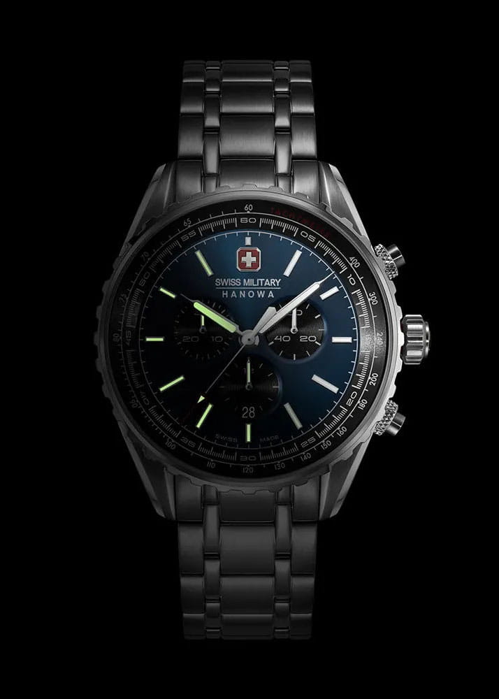 Мужские швейцарские часы Swiss Military Hanowa Afterburn Chrono SMWGI0000308 с хронографомХронографФункция позволяет измерять отрезки времени с особой точностью: часы, минуты, секунды. Верным признаком хронографа является наличие на циферблате 3 дополнительных окошек-счётчиков. и секундомеромСекундомерСекундоме́р — прибор, способный измерять интервалы времени с точностью до долей секунды.. Сапфировое стеклоСапфировое стеклоПрочный и надёжный материал из кристалла сапфира синтетического происхождения, характеризующийся особой твёрдостью и устойчивостью к царапинам и повреждениям. с антибликовым покрытием защищает циферблат от царапин и обеспечивает отличную читаемость при любом освещении. Корпус из нержавеющей стали диаметром 44 мм сбалансирован и элегантен. Браслет с раскладной застёжкойРаскладная застёжкаТакой тип застёжки используется только на браслетах из металла. Она никогда не раскрывается полностью, происходит разделение на 2 и более частей. Раскладывающая застёжка снизит вероятность потери часов к минимуму. идеально дополняют дизайн часов, обеспечивая комфортное ношение. Люминесцентное покрытиеЛюминесцентное покрытиеПозволяет считывать показания времени в темноте. Производители наносят на стрелки, часовые индексы, безель или поверхность циферблата светонакопительный состав, дающий холодное свечение. стрелок и меток позволит вам следить за временем даже в полной темноте. Стальной безельБезельВнешний ободок, закрепляющий стекло. В спортивных часах так называется поворотное кольцо с делениями на циферблате, выполняет роль таймера – замеряет отрезки времени на шкале. Неподвижный безель – элемент декора. Однонаправленно вращающийся безель на дайверских часах позволяет фиксировать моменты погружения и выныривания на поверхность. с PVD-покрытиемPVDУльтратонкое покрытие наносится в технике вакуумного напыления, сочетает в себе нитрид титана особой прочности со слоем золота или оксида хрома. Несёт в себе декоративную или защитную функцию.. Часы оснащены центральной секундной стрелкой и окошком даты в положении «6 часов», что делает их функциональными для повседневного использования. ТахиметрТахиметрРазмеченная шкала, располагается на ободке или безеле часов. Тахиметр позволяет рассчитать скорость на определённом участке пути, расстояние измеряется в километрах или милях. по внешнему краю. Водонепроницаемость до 100 метров. Идеальный выбор для тех, кто ценит качество и долговечность.