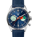 Механические часы-хронографХронографФункция позволяет измерять отрезки времени с особой точностью: часы, минуты, секунды. Верным признаком хронографа является наличие на циферблате 3 дополнительных окошек-счётчиков. TAG Heuer Carrera Skipper CBS2213.FN6002. Автоматический механизм с высокой точностью. Сапфировое стеклоСапфировое стеклоПрочный и надёжный материал из кристалла сапфира синтетического происхождения, характеризующийся особой твёрдостью и устойчивостью к царапинам и повреждениям. устойчивое к появлению царапин, обладающее высокой прозрачностью. Класс водозащиты: 100 метров, позволит плавать, нырять и заниматься другими водными видами спорта. Стрелки с люминесцентным покрытиемЛюминесцентное покрытиеПозволяет считывать показания времени в темноте. Производители наносят на стрелки, часовые индексы, безель или поверхность циферблата светонакопительный состав, дающий холодное свечение.. Корпус часов изготовлен из нержавеющей стали. Тканевый ремешок с раскладной застёжкойРаскладная застёжкаТакой тип застёжки используется только на браслетах из металла. Она никогда не раскрывается полностью, происходит разделение на 2 и более частей. Раскладывающая застёжка снизит вероятность потери часов к минимуму..