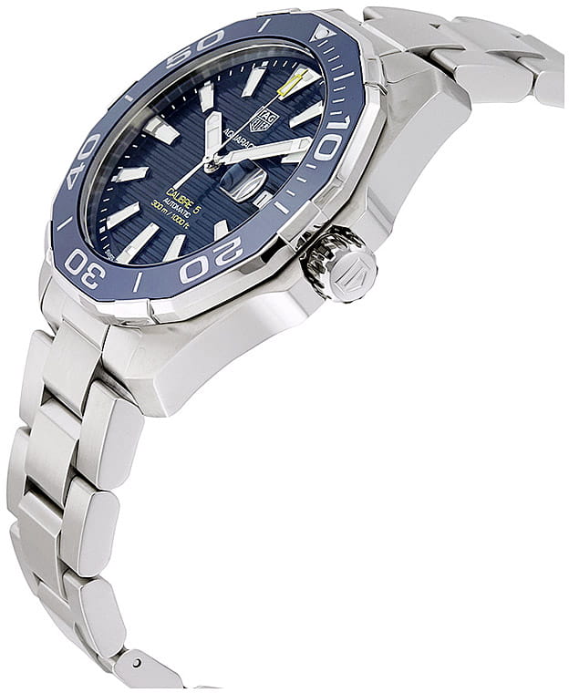 TAG Heuer Aquaracer WAY201B.BA0927 — стильные и надёжные часы, созданные для активного образа жизни и погружений. Корпус диаметром 43 мм выполнен из нержавеющей стали с матовой и полированной отделкой, что придаёт модели элегантный и динамичный вид. Однонаправленный вращающийся безельБезельВнешний ободок, закрепляющий стекло. В спортивных часах так называется поворотное кольцо с делениями на циферблате, выполняет роль таймера – замеряет отрезки времени на шкале. Неподвижный безель – элемент декора. Однонаправленно вращающийся безель на дайверских часах позволяет фиксировать моменты погружения и выныривания на поверхность. с керамической вставкой глубокого синего цвета оснащён минутной разметкой и светящимся маркером на позиции «12 часов», обеспечивая удобство при отсчёте времени погружения. Синий циферблат с горизонтальным гильоше дополнен накладными часовыми индексами и стрелками с люминесцентным покрытиемЛюминесцентное покрытиеПозволяет считывать показания времени в темноте. Производители наносят на стрелки, часовые индексы, безель или поверхность циферблата светонакопительный состав, дающий холодное свечение., что гарантирует превосходную читаемость в любых условиях освещения. Окошко даты с увеличительным стеклом расположено на отметке «3 часа» для удобства. Защиту циферблата обеспечивает сапфировое стеклоСапфировое стеклоПрочный и надёжный материал из кристалла сапфира синтетического происхождения, характеризующийся особой твёрдостью и устойчивостью к царапинам и повреждениям. с антибликовым покрытиемАнтибликовое покрытиеСлой оксида металла в 0,13-0,3 микрон, благодаря которому стекло часов не бликует и не отражает свет. Антибликовое покрытие уменьшает отражение света в 10 раз, обеспечивая отличную читаемость показателей циферблата.. Внутри установлен швейцарский автоматический механизм Calibre 5, обеспечивающий точность хода и запас энергии до 38 часов. Часы укомплектованы браслетом из нержавеющей стали с чередующейся полированной и матовой отделкой, а раскладная застёжкаРаскладная застёжкаТакой тип застёжки используется только на браслетах из металла. Она никогда не раскрывается полностью, происходит разделение на 2 и более частей. Раскладывающая застёжка снизит вероятность потери часов к минимуму. с двойной блокировкой и кнопками гарантирует надёжную фиксацию на запястье. Водонепроницаемость 300 метров делает модель идеальным выбором для занятий водными видами спорта, включая дайвинг.