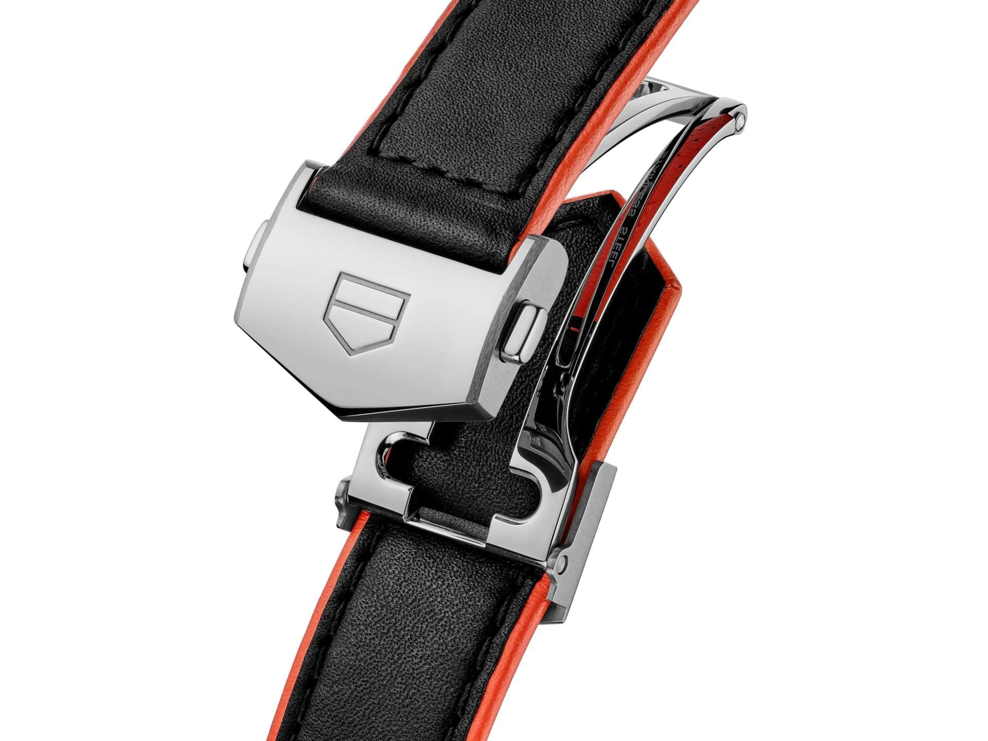 TAG Heuer Carrera Date WBN2110.FC6623 - сочетают в себе яркий характер и современный стиль. Чёрный циферблат с отделкой Azurage, автоматический механизм Calibre 5 обеспечивает стабильную работу. Корпус из полированной и сатинированной стали диаметром 39 мм предлагают отличную считываемость показаний – идеальный выбор для тех, кто ценит элегантность и функциональность. Сапфировое стеклоСапфировое стеклоПрочный и надёжный материал из кристалла сапфира синтетического происхождения, характеризующийся особой твёрдостью и устойчивостью к царапинам и повреждениям. с антибликовым покрытиемАнтибликовое покрытиеСлой оксида металла в 0,13-0,3 микрон, благодаря которому стекло часов не бликует и не отражает свет. Антибликовое покрытие уменьшает отражение света в 10 раз, обеспечивая отличную читаемость показателей циферблата. устойчивое к появлению царапин, обладающее высокой прозрачностью. Стрелки с люминесцентным покрытиемЛюминесцентное покрытиеПозволяет считывать показания времени в темноте. Производители наносят на стрелки, часовые индексы, безель или поверхность циферблата светонакопительный состав, дающий холодное свечение. Super-LumiNova® — для превосходной читаемости в любых условиях. Аккуратное окошко даты на отметке «6 часов» сохраняет гармоничные пропорции корпуса. Спортивный кожаный ремешок с раскладной застёжкойРаскладная застёжкаТакой тип застёжки используется только на браслетах из металла. Она никогда не раскрывается полностью, происходит разделение на 2 и более частей. Раскладывающая застёжка снизит вероятность потери часов к минимуму. и оранжевыми акцентами придают модели вневременную привлекательность. Класс водозащиты: 100 метров позволит плавать, нырять и заниматься другими водными видами спорта.