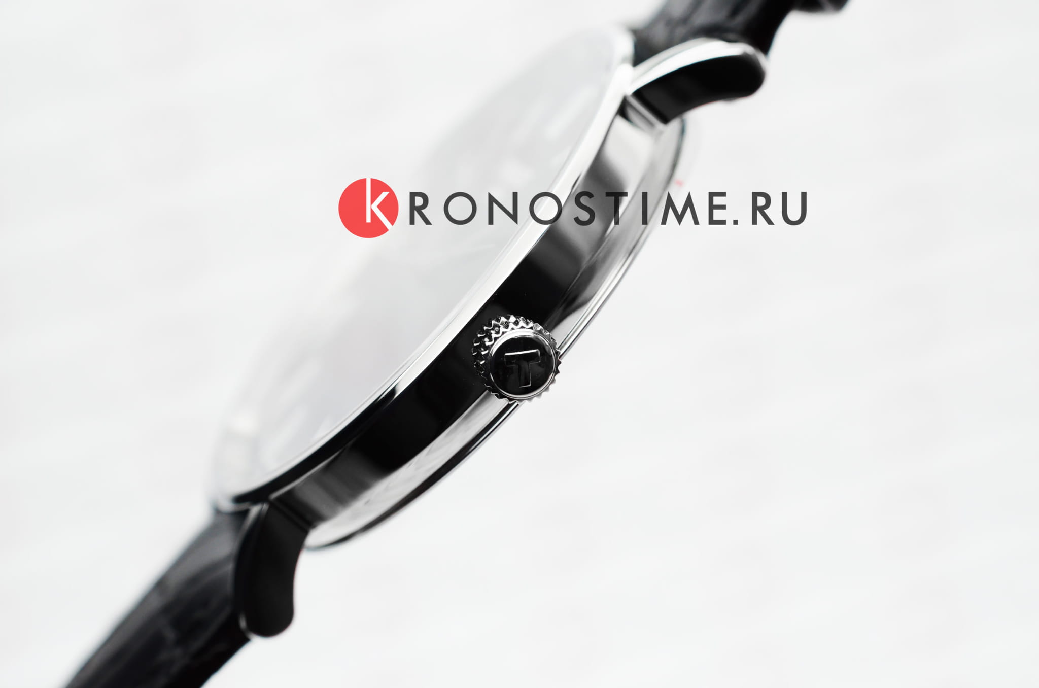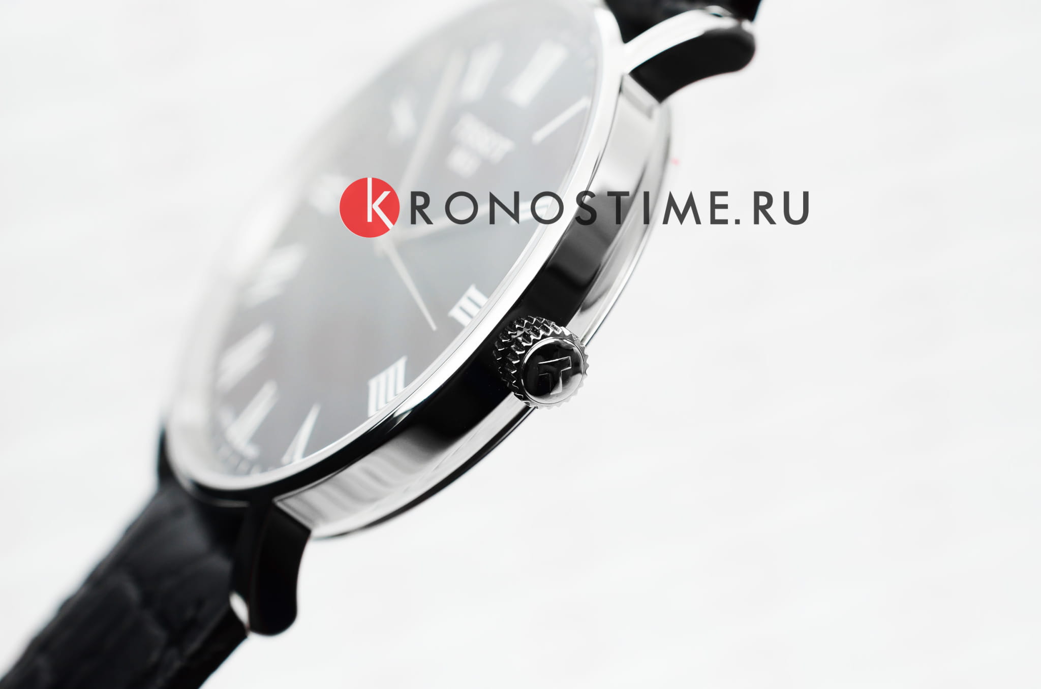 Наручные часы с чёрным кожаным ремешком, поверхность которого имеет тиснение под кожу крокодила, выгодно подчеркнут ваш безупречный вкус. Индикатор разряда батарейки- EOLEOLПредставляет собой систему, уведомляющую владельца часов о необходимости замены элемента питания. За 2 недели до полного разряда батарейки секундная стрелка перестаёт ходить чётко и начинает перепрыгивать на 3-4 деления.. Строгий минималистический дизайн циферблата с римскими цифрами делает модель лучшим вариантом для дополнения делового костюма. Высокая точность хода кварцевого калибра ETA 902.101 с 4 камнями. Устойчивое к появлению царапин стекло из сапфирaСапфировое стеклоПрочный и надёжный материал из кристалла сапфира синтетического происхождения, характеризующийся особой твёрдостью и устойчивостью к царапинам и повреждениям.. Водостойкость 3 бар.