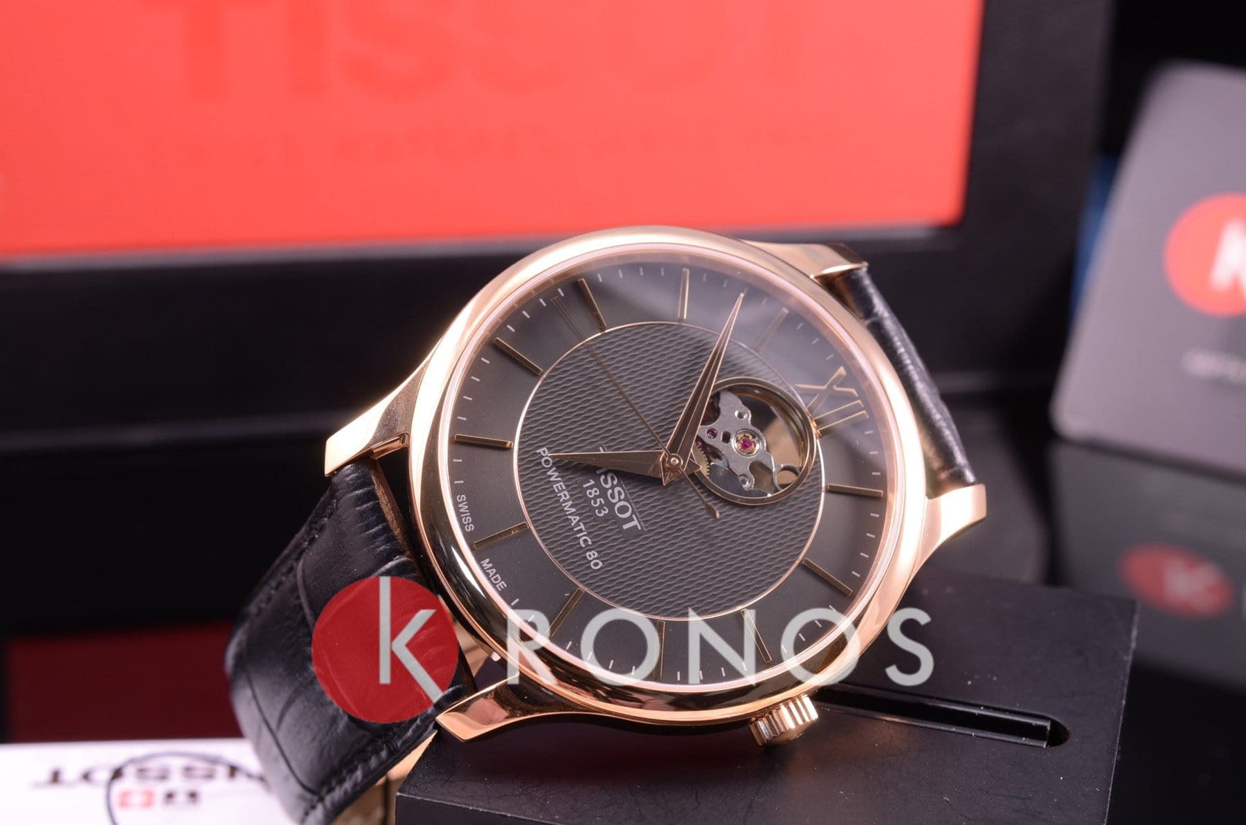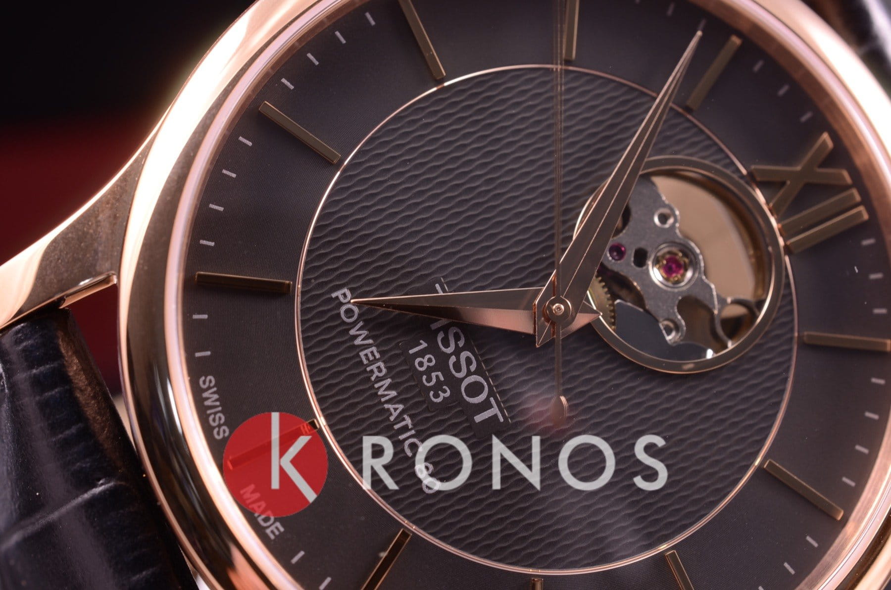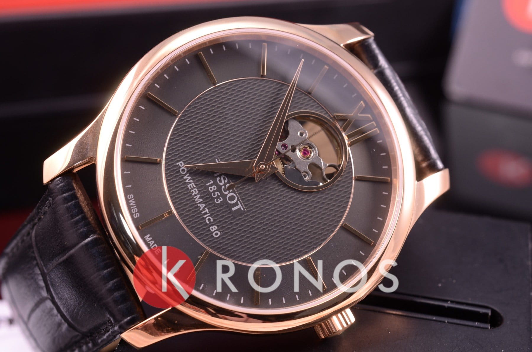 Наручные часы с гильошированным циферблатом «Open Heart» позволяют наблюдать за движением деталей автоматического механизма ETA Powermatic 80Powermatic 80Эксклюзивный калибр от швейцарской компании ETA с увеличенным запасом хода до 80 часов за счёт удлинённой заводной пружины. Характеризуется улучшенной системой спуска со сниженным трением. сквозь миниатюрное окошко, этому же способствует и прозрачная задняя крышка. Лаконичности придаёт чёрный ремешок из натуральной кожи. Корпус с PVD-покрытиемPVDУльтратонкое покрытие наносится в технике вакуумного напыления, сочетает в себе нитрид титана особой прочности со слоем золота или оксида хрома. Несёт в себе декоративную или защитную функцию. цвета розового золота. Выпуклое сапфировое стекло. Водонепроницаемость до 3 бар. . Габариты: 40 x 40 x 9,4 мм.