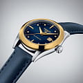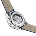 , мягкий блеск идеально гармонирует с ремешком из натуральной телячьей кожи. Классический циферблат дымчатого оттенка с узором «солнечные лучи» декорирован 8 бриллиантами в 0,016 карат, заменяющими индексы. Модель оснащена уникальным автоматическим механизмом ETA Powermatic 48.111, сохраняющим запас хода на 48 часов. Калибр украшен волновыми узорами, его безупречная отделка просматривается сквозь прозрачную заднюю крышку. Сапфировое стекло препятствует образованию царапин. Сохраняется водонепроницаемость до 5 бар. На позиции 3 часов – апертура даты. Габариты: 29 x 29 x 10,4 мм.