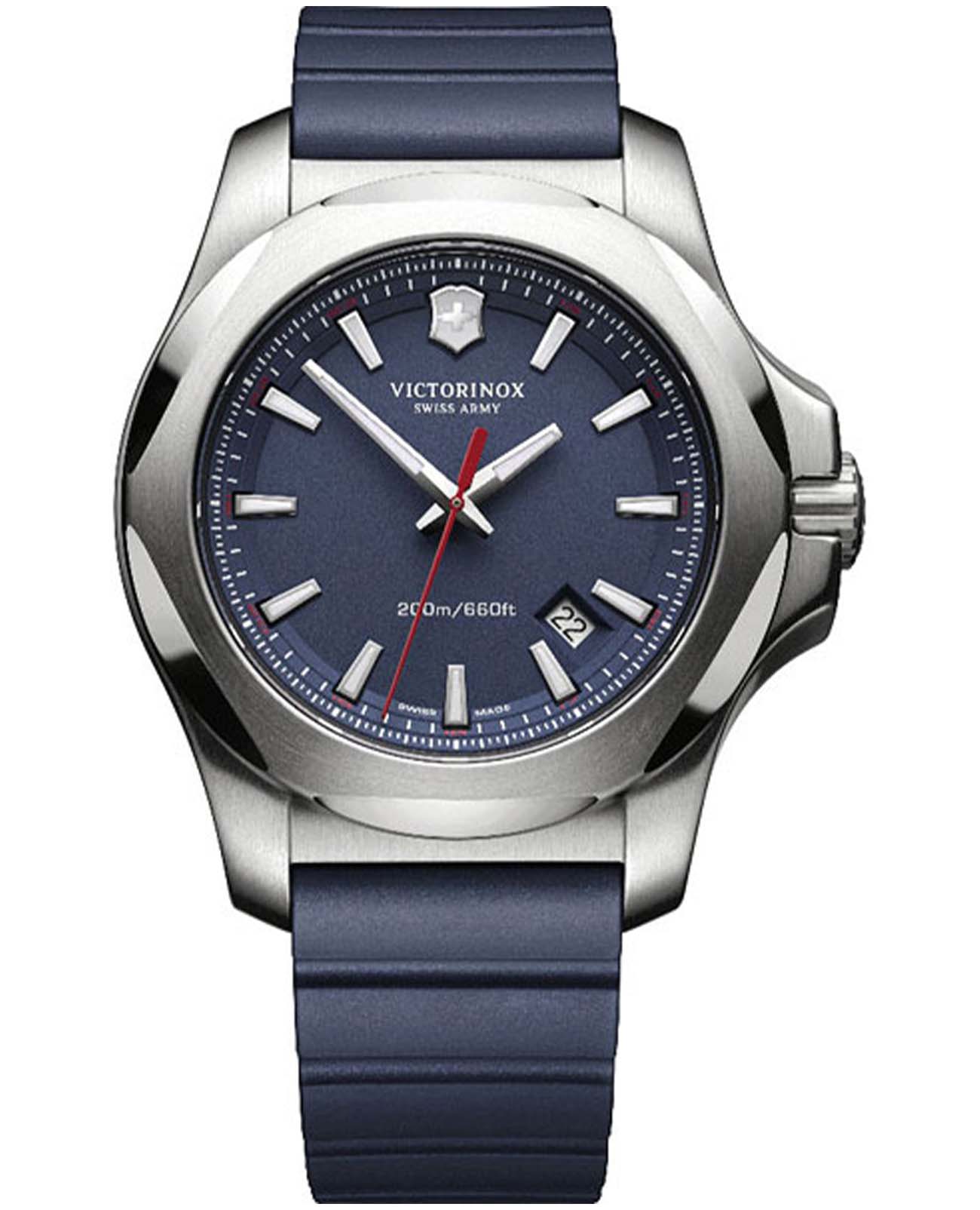 Мужские швейцарские часы Victorinox I.N.O.X. 241688.1. Сапфировое стеклоСапфировое стеклоПрочный и надёжный материал из кристалла сапфира синтетического происхождения, характеризующийся особой твёрдостью и устойчивостью к царапинам и повреждениям. с трёхслойным антибликовым покрытием. Корпус часов выполнен из нержавеющей стали 316L. Влагозащита: 200 метров, позволит плавать, нырять и заниматься другими водными видами спорта. Окошко даты находится в положении между 4 и 5 часов. Стрелки и метки с люминесцентным покрытиемЛюминесцентное покрытиеПозволяет считывать показания времени в темноте. Производители наносят на стрелки, часовые индексы, безель или поверхность циферблата светонакопительный состав, дающий холодное свечение.. Функция индикации заряда EOLEOLПредставляет собой систему, уведомляющую владельца часов о необходимости замены элемента питания. За 2 недели до полного разряда батарейки секундная стрелка перестаёт ходить чётко и начинает перепрыгивать на 3-4 деления.. Съемный защитный бампер.