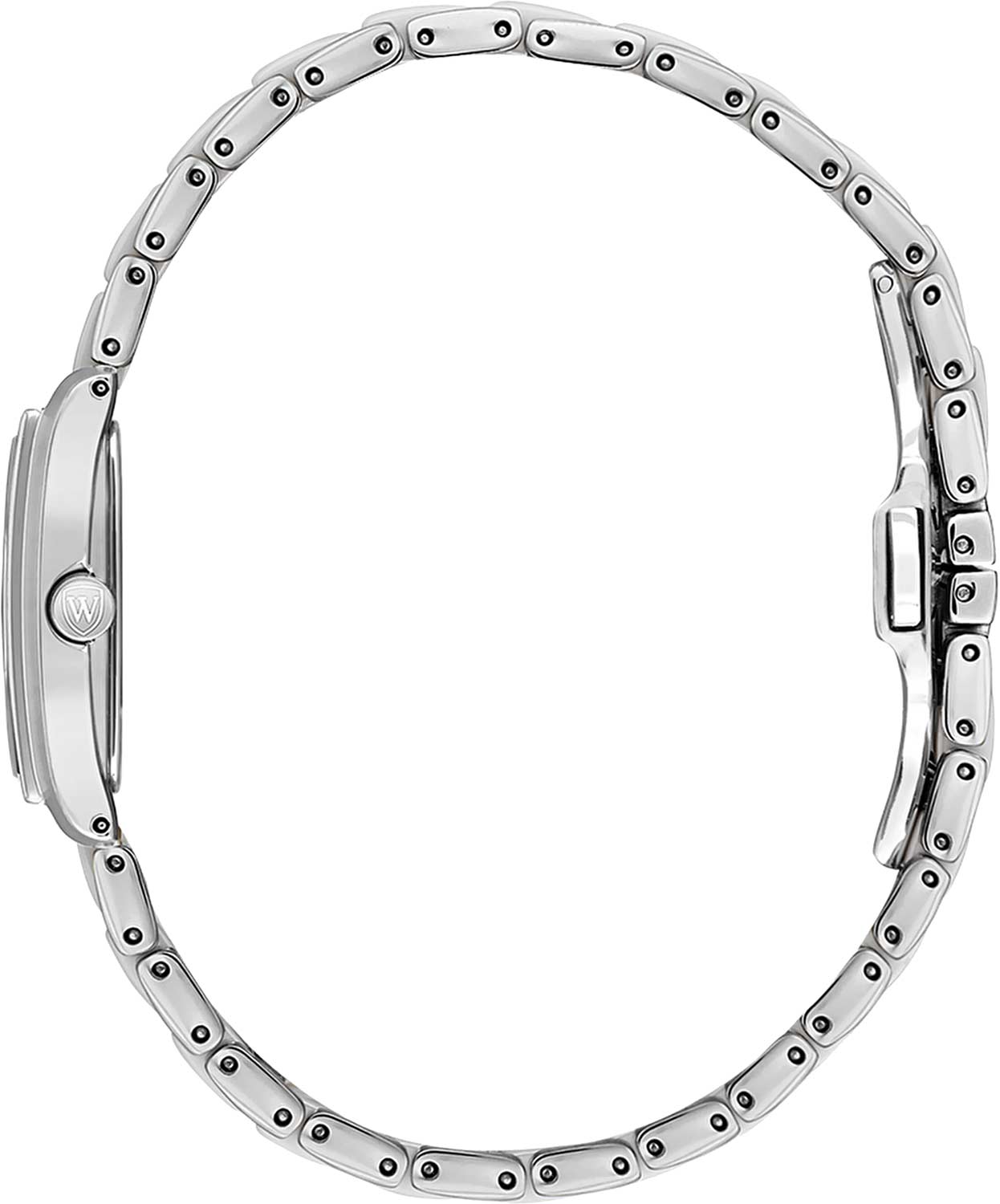 Швейцарские женские кварцевые часы Wainer WA.18060-A станут элегантным дополнением любого образа. Прямоугольный корпус из нержавеющей стали 316L размером 22х24.5 мм и толщиной 8 мм защищен прочным сапфировым стекломСапфировое стеклоПрочный и надёжный материал из кристалла сапфира синтетического происхождения, характеризующийся особой твёрдостью и устойчивостью к царапинам и повреждениям.. Белый циферблат с метками в виде штрихов украшен кристаллом в положении 12 часов, а заводная головка с фирменным логотипом добавляет модели особый шарм. Часы имеют класс водозащиты 30 метров, позволит защитить корпус от случайных брызг или капель дождя. Модель комплектуется стальным браслетом из нержавеющей стали 316L с керамическими вставками на раскладной застёжкеРаскладная застёжкаТакой тип застёжки используется только на браслетах из металла. Она никогда не раскрывается полностью, происходит разделение на 2 и более частей. Раскладывающая застёжка снизит вероятность потери часов к минимуму., длина браслета составляет 180 мм. Вес часов 88 грамм обеспечивает комфортное ношение в течение дня. Элегантный дизайн и надежное качество швейцарского производства делают эти часы превосходным выбором для современной женщины.